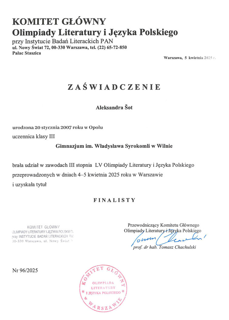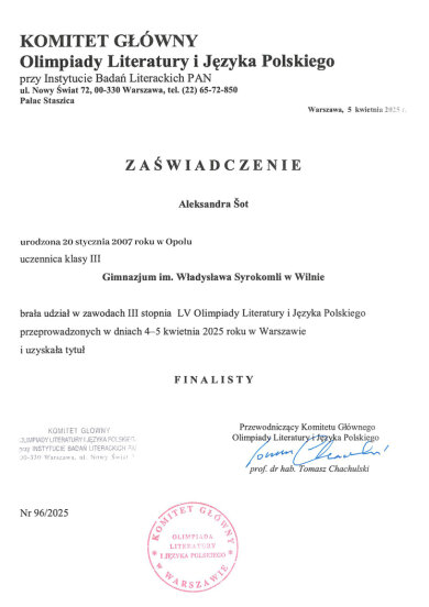 Sveikiname IIIb klasės mokinę Aleksandrą Šot, tapusią tarptautinės LV lenkų kalbos ir literatūros olimpiados Lenkijoje finalininke. Sveikiname olimpiadai mokinę rengusią lenkų kalbos mokytoją metodininkę Liuciją Minovič.