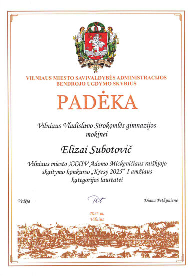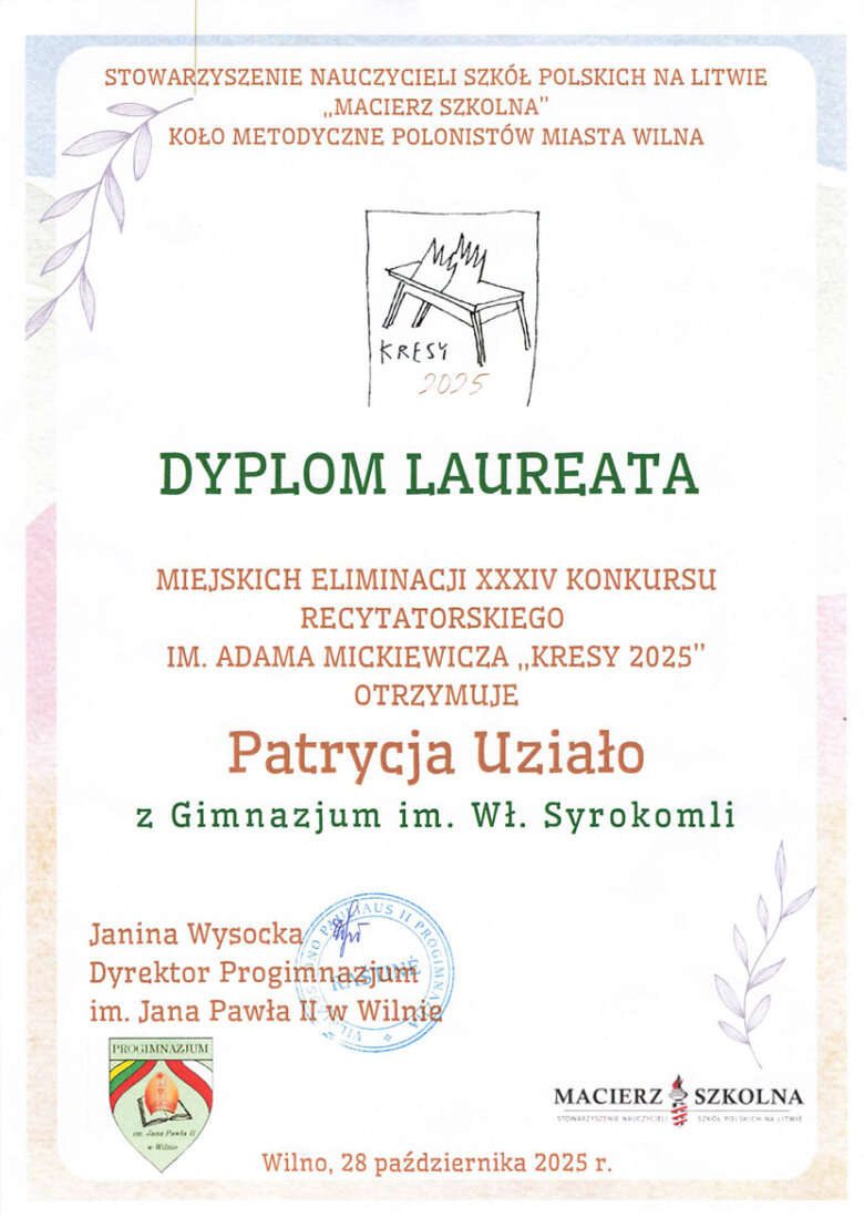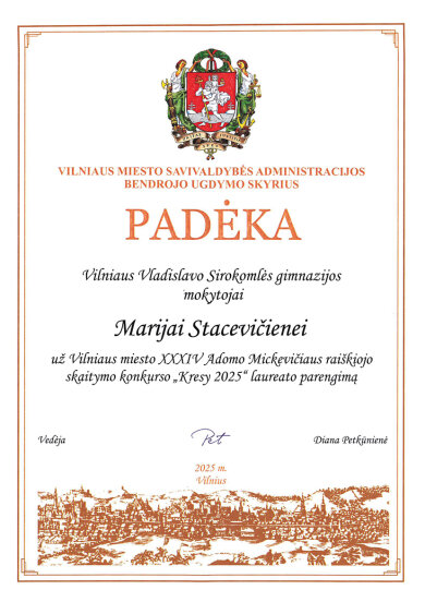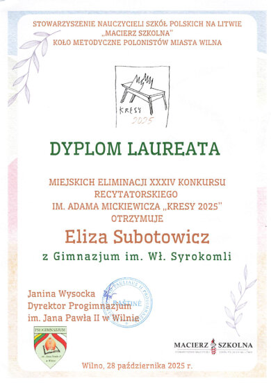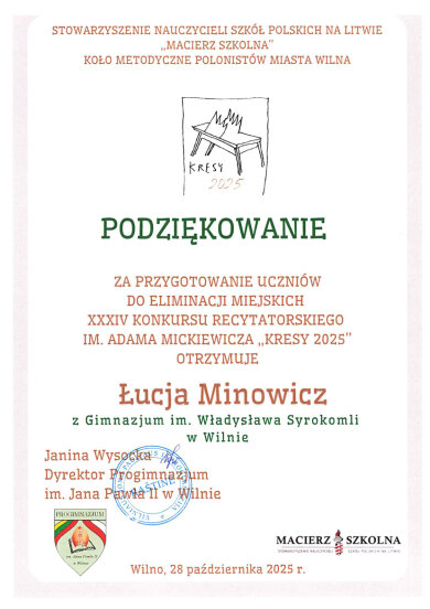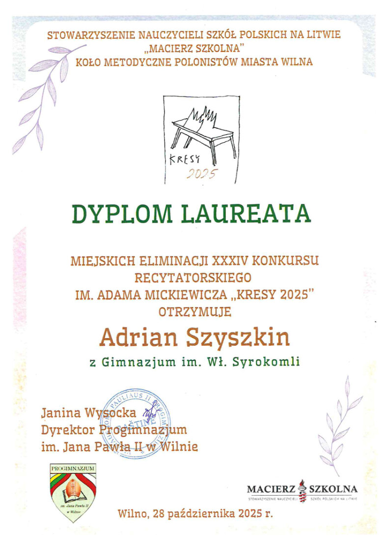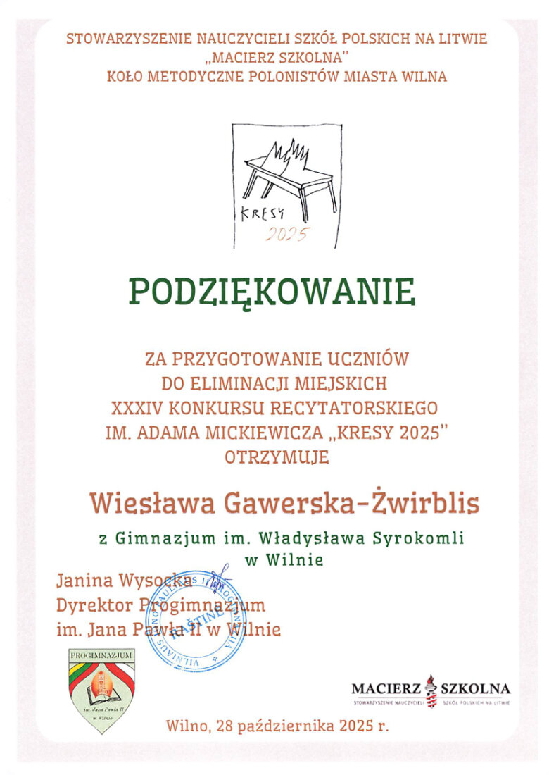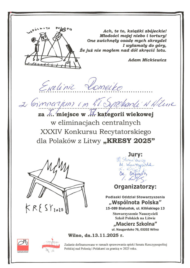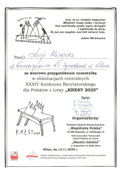 Sveikiname mokinius: Eveliną Romeiko (IVb klasė, mokytoja L. Minovič), Adrianą Šiškiną (7a klasė, mokytoja V. Gaverska-Žvirblis), Eliza Subotovič (2b klasė, mokytoja. L. Godvod), Patrycja Uzialo (grupė „Krasnoludki”, mokytojos: M. Stacevičienė, R. Jablonska), tapusius laureatais Vilniaus miesto XXXIV Adomo Mickevičiaus raiškiojo skaitymo konkurso „Kresy 2025“ miesto etape. Sveikiname mokinius ir jų konkursui rengusias mokytojas.