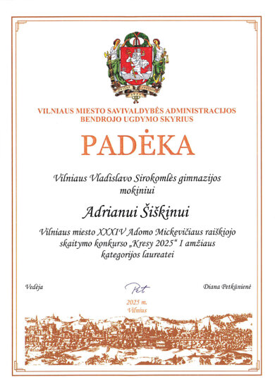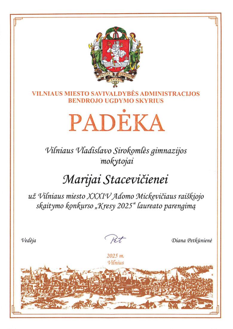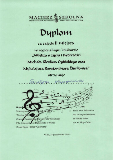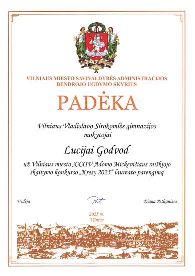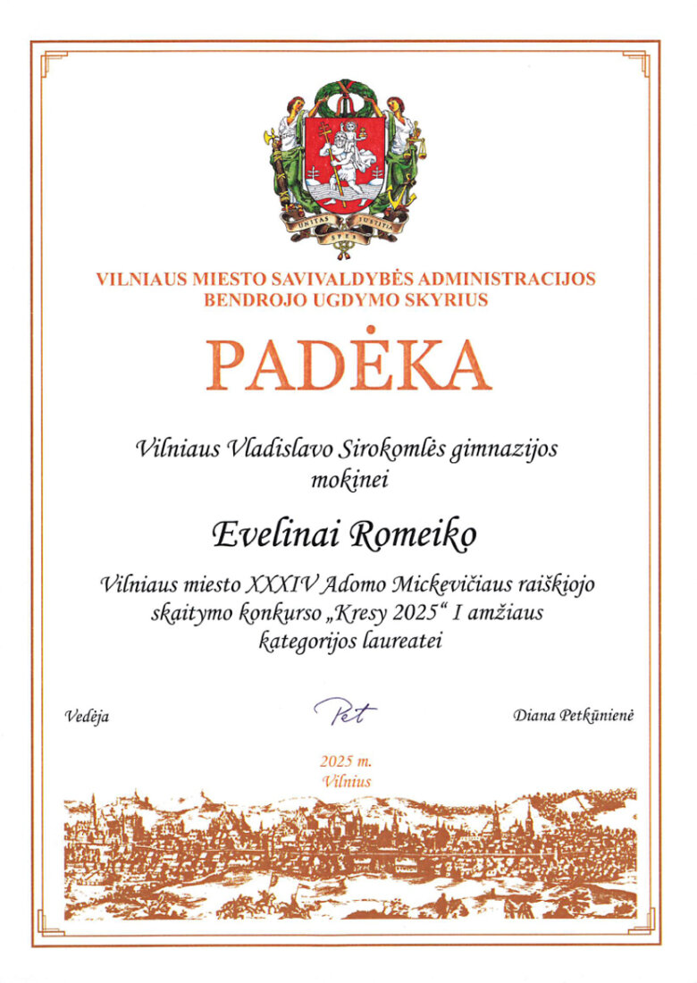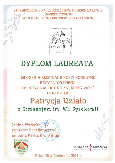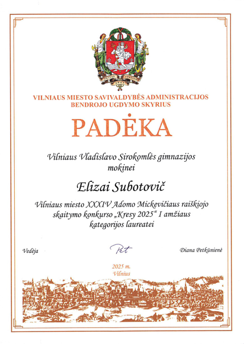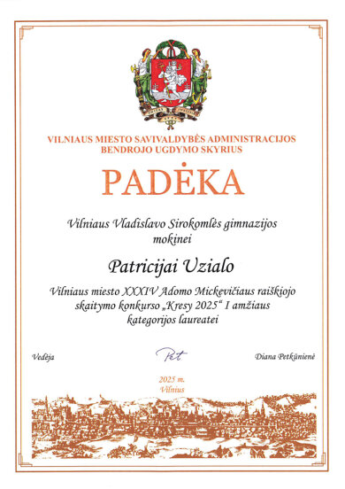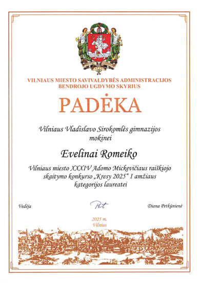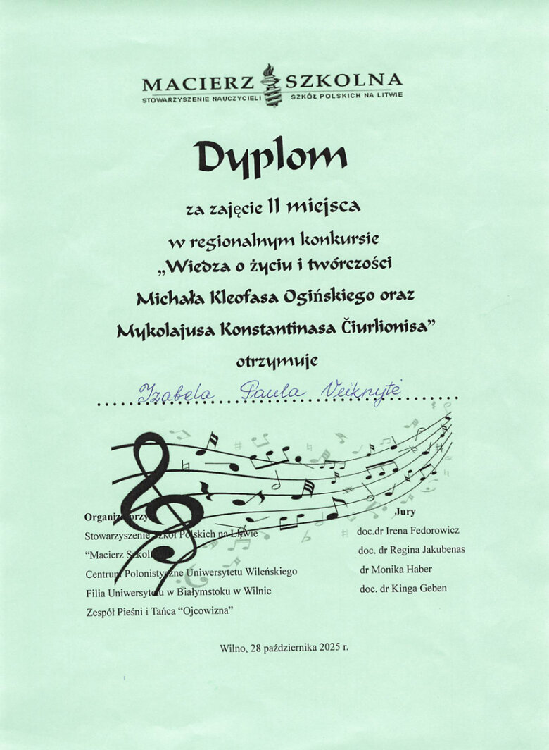 Sveikiname mokinius: Eveliną Romeiko (IVb klasė, mokytoja L. Minovič), Adrianą Šiškiną (7a klasė, mokytoja V. Gaverska-Žvirblis), Eliza Subotovič (2b klasė, mokytoja. L. Godvod), Patrycja Uzialo (grupė „Krasnoludki”, mokytojos: M. Stacevičienė, R. Jablonska), tapusius laureatais Vilniaus miesto XXXIV Adomo Mickevičiaus raiškiojo skaitymo konkurso „Kresy 2025“ miesto etape. Sveikiname mokinius ir jų konkursui rengusias mokytojas.