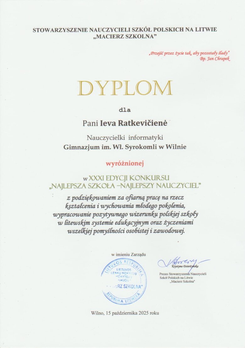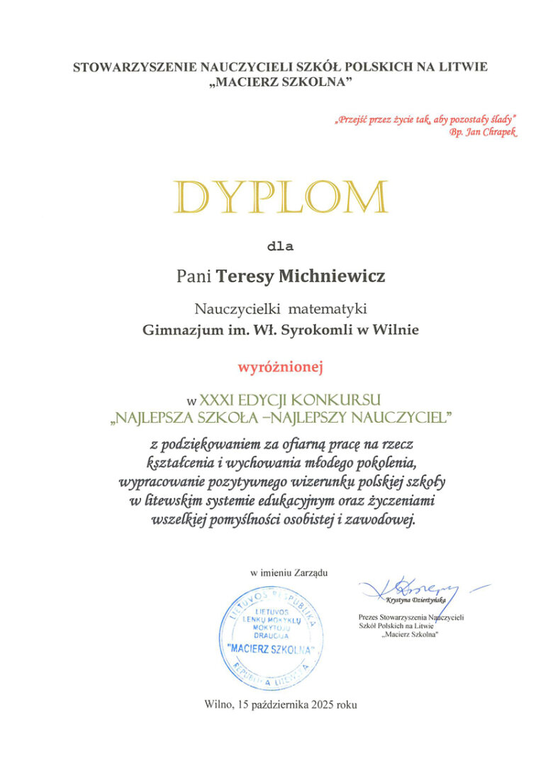 Sveikiname mūsų gimnazijos mokytojas: matematikos mokytoją metodininkę Teresą Michnevič ir informatikos mokytoją ekspertę Ievą Ratkevičienę, gavusias apdovanojimus XXXI konkurse „Geriausia mokykla – geriausias mokytojas“ tarp Vilniaus miesto lenkų mokyklų. Konkursą organizuoja Lietuvos lenkų mokyklų mokytojų draugija „Macierz Szkolna“.