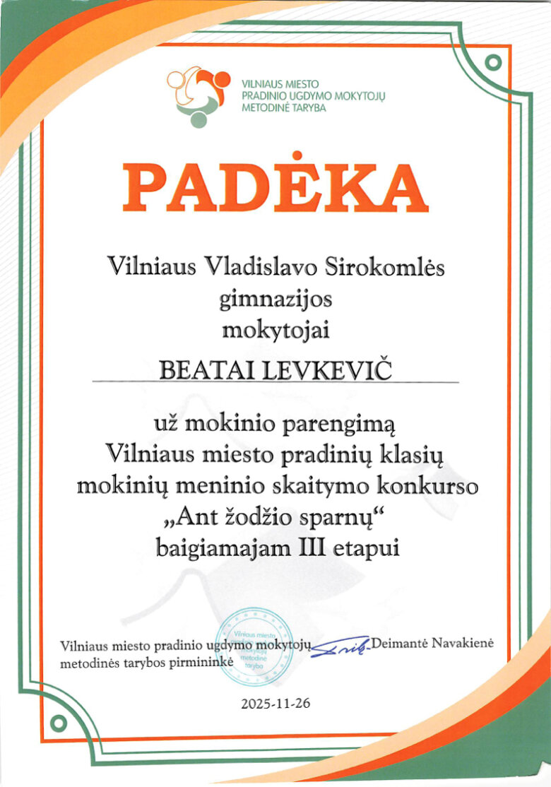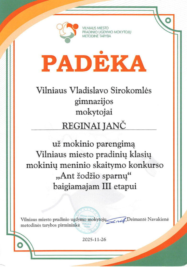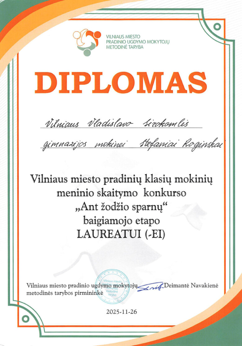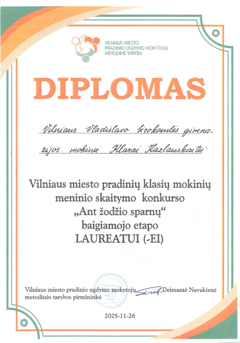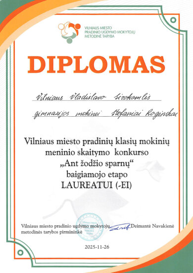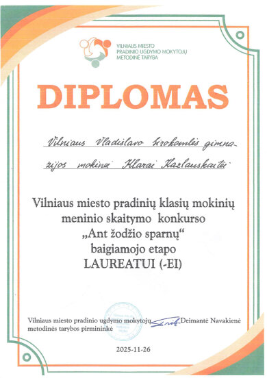 Sveikiname mokines: Klarą Kazlauskaitę (2b klasė) ir Stefanią Roginską (3a klasė), tapusias Vilniaus miesto pradinių klasių mokinių meninio skaitymo konkurso „Ant žodžio sparnų“ III etapo laureatėmis. Sveikiname konkursui moksleives rengusias lietuvių kalbos mokytojas: Reginą Janč ir Beatą Levkevič.