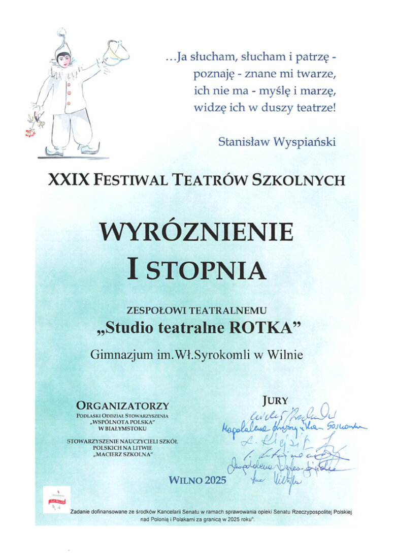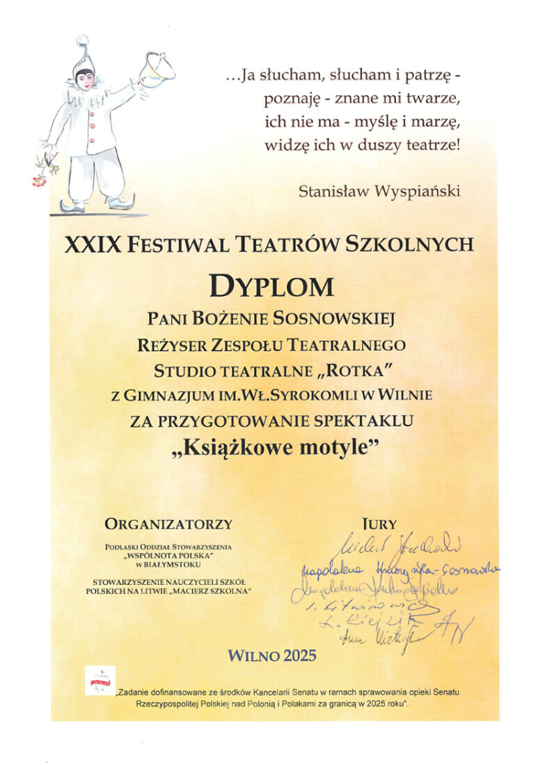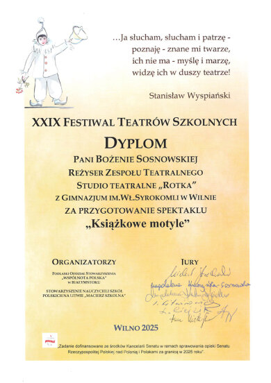 Sveikiname mūsų gimnazijos teatro studijos „Rotka” kolektyvą (meno vadovė Bożena Sosnovska), gavusį dyplomą su pagyrimu XIX mokyklinių teatrų festivalyje. Teatro studija pristatė spektaklį „Książkowe motyle“ („Knygų drugeliai“).