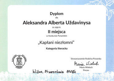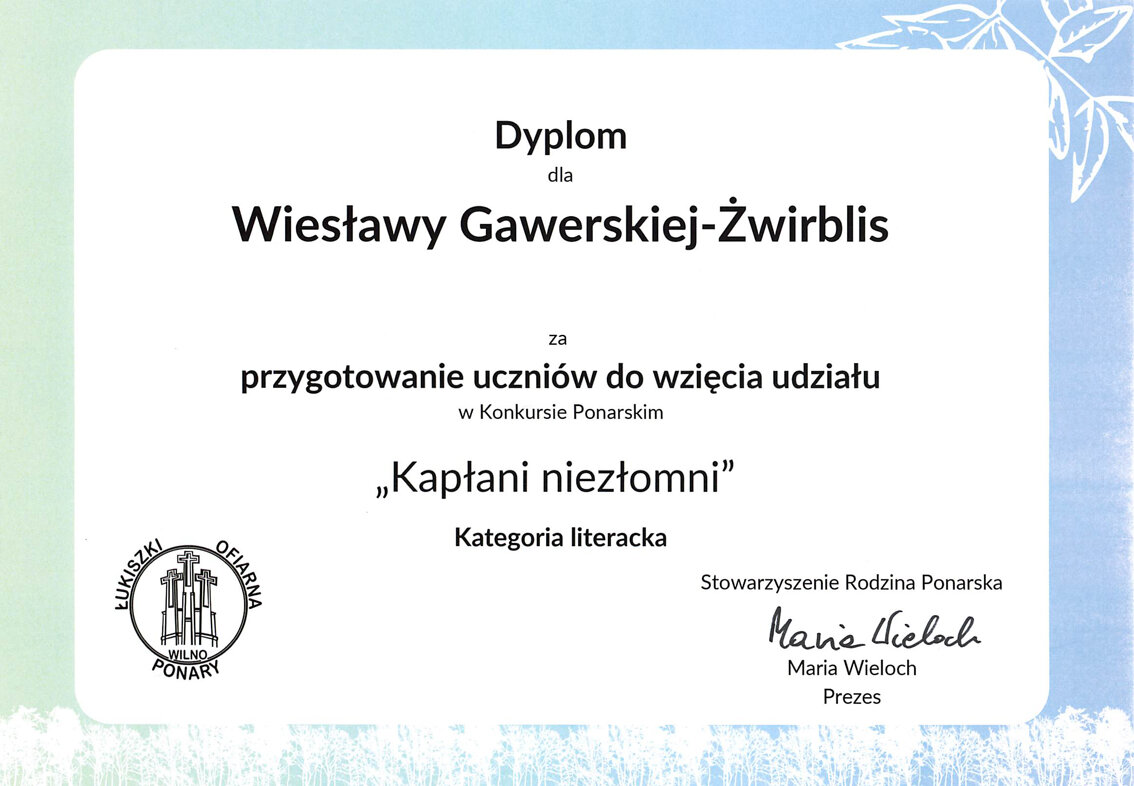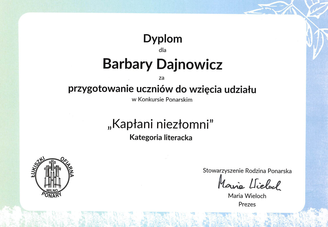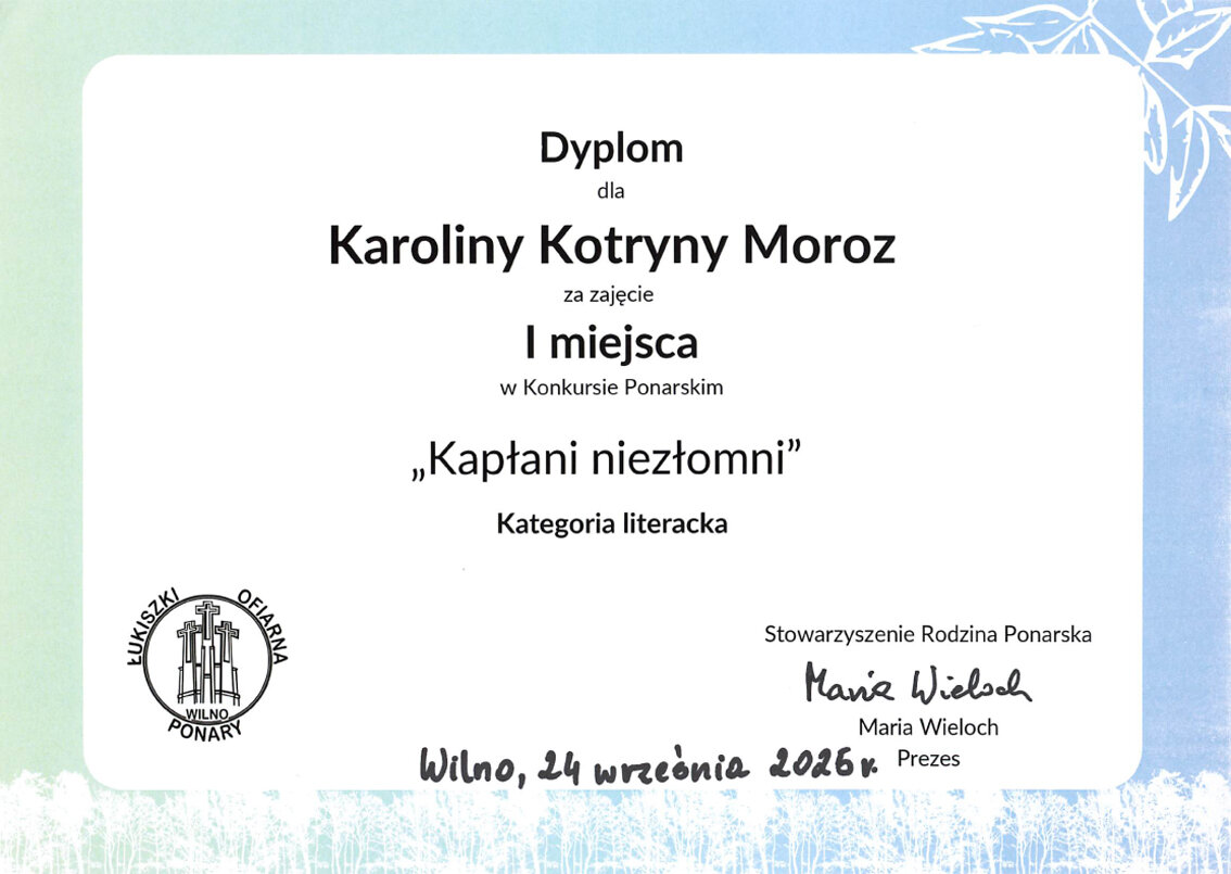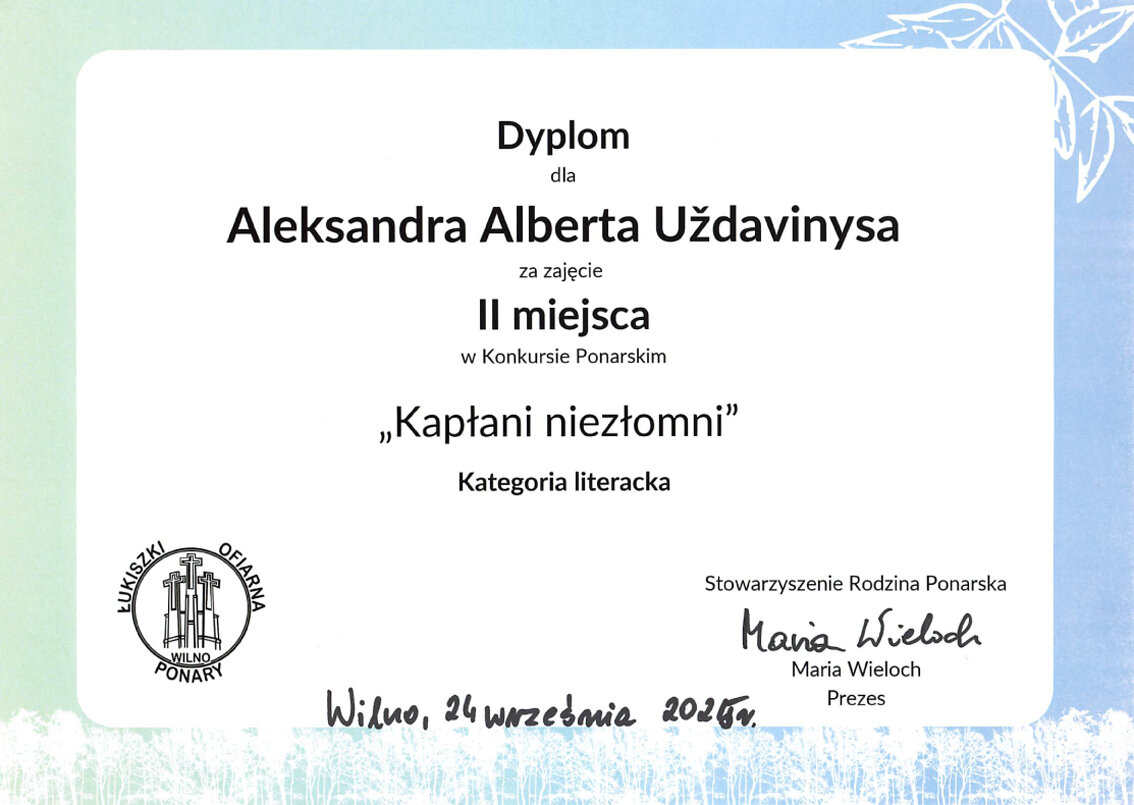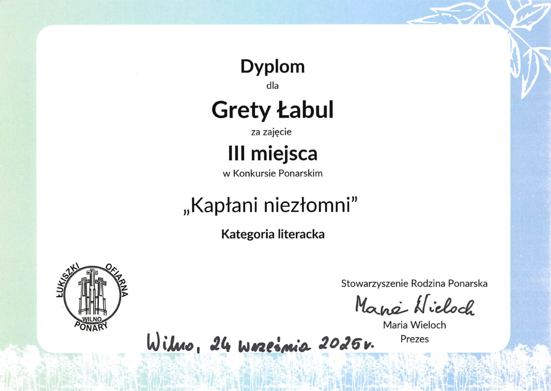 Sveikiname mūsų gimnazijos mokinius: Karoliną Moroz (IIIb klasė), užėmusią I vietą, Aleksandrą Uždavinį (IIIa klasė), užėmusį II vietą, Gretą Labul (IIIb klasė), užėmusią III vietą, literatūriame konkurse „Ponarski_2025“. Sveikiname konkursui moksleivius rengusias mokytojas: lenkų kalbos vyresniąją mokytoją Veslavą Gaverską Žvirblis ir lenkų kalbos mokytoją metodininkę Barbarą Dainovič.