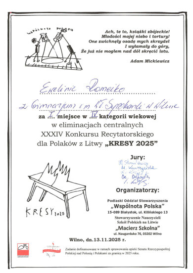 Sveikiname IVb klasės mokinę Eveliną Romeiko, užėmusią I vietą XXXIV raiškiojo skaitymo konkurso „KRESY 2025“ respublikiniame etape. Sveikiname konkursui moksleivę rengusią lenkų kalbos mokytoją metodininkę Luciją Minovič.
