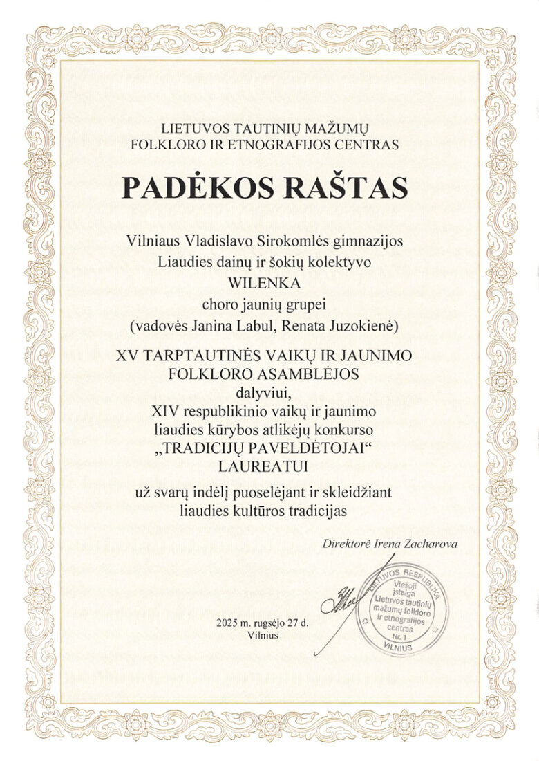 Sveikiname liaudies dainų ir šokių kolektyvo „Wilenka“ choro jaunių grupę, tapusią XIV respublikinio vaikų ir jaunimo konkurso liaudies kūrybos atlikėjų konkurso „Tradicijų paveldėtojai“ laureate. Sveikiname konkursui rengusias muzikos mokytojas ekspertes: Janiną Labul ir Renatą Juzokienę.