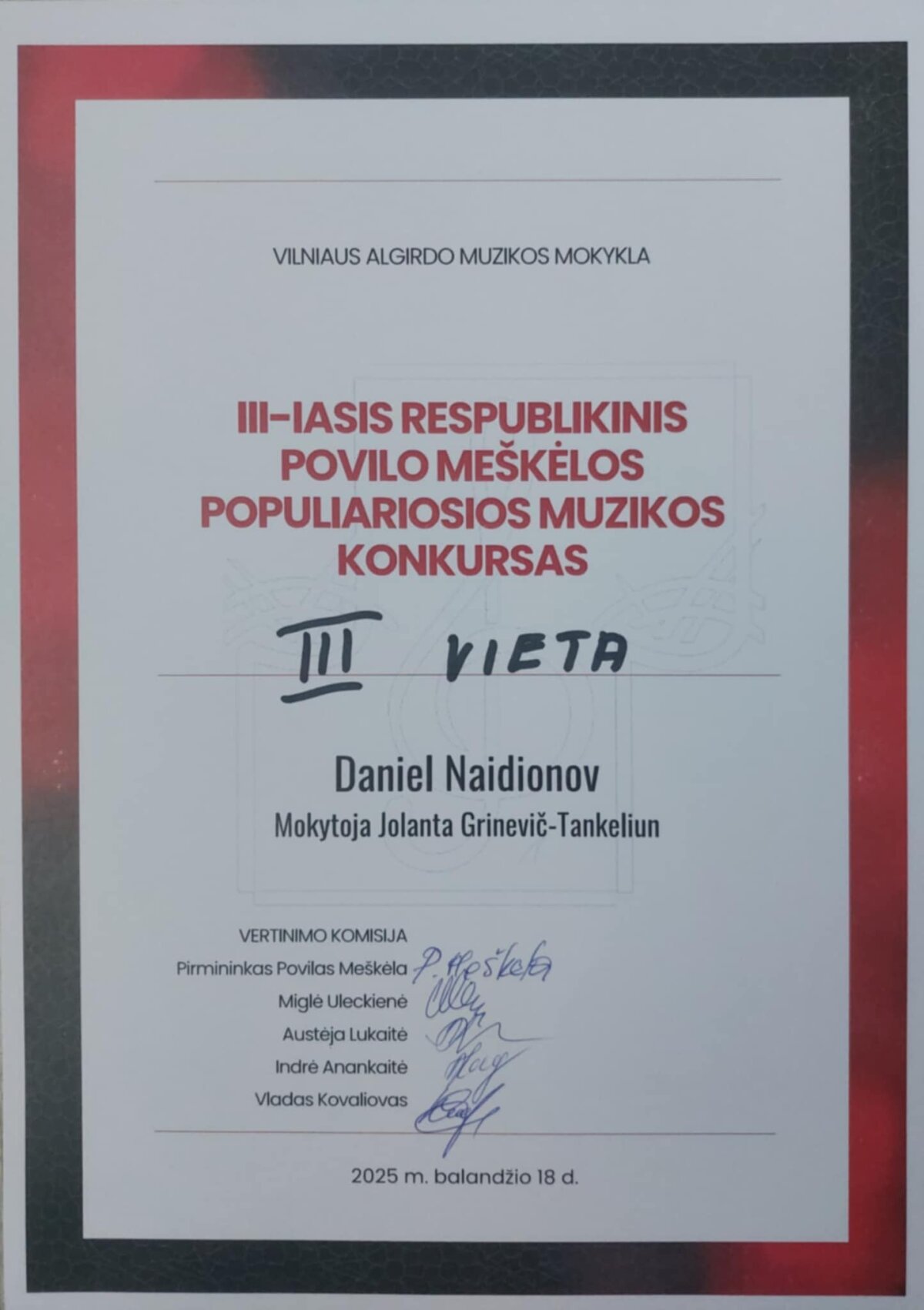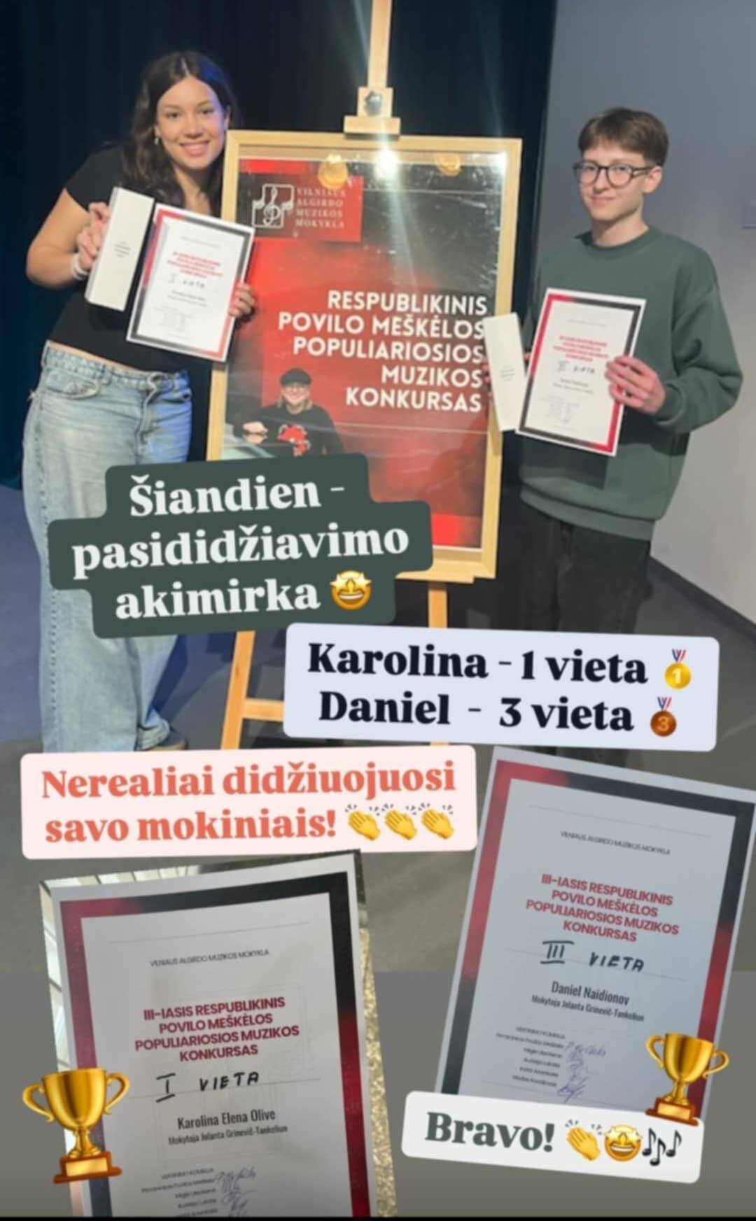 Džiaugiamės galėdami pasidalinti džiugiomis naujienomis – mūsų gimnazijos Ia klasės mokinys Danielis Naidionovas sėkmingai pasirodė III-ajame respublikiniame Povilo Meškėlos populiariosios muzikos konkurse, kuriame užėmė garbingą 3-iąją vietą. Šis konkursas, pritraukęs daug talentingų jaunųjų atlikėjų iš visos Lietuvos, reikalavo ne tik puikių vokalinių gebėjimų, bet ir artistiškumo bei sceninės drąsos. Danielis savo pasirodymu sužavėjo tiek komisiją, tiek žiūrovus, įrodydamas, kad nuoširdus darbas, kūrybiškumas ir meilė muzikai veda į reikšmingus laimėjimus. Didžiuojamės Danielio pasiekimu ir linkime jam tolesnės kūrybinės sėkmės, drąsos siekti svajonių bei naujų aukštumų muzikos pasaulyje!