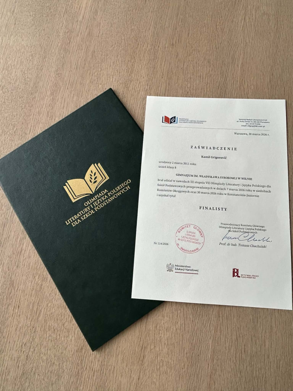 Didžiuodamiesi pranešame apie dar vieną mūsų mokinio pasiekimą! 8b klasės mokinys Kamil Grigorovič tapo VII Lenkų kalbos ir literatūros olimpiados pagrindinių mokyklų mokiniams III etapo finalininku. Finalas vyko 2026 m. kovo 7 d. Varšuvoje.