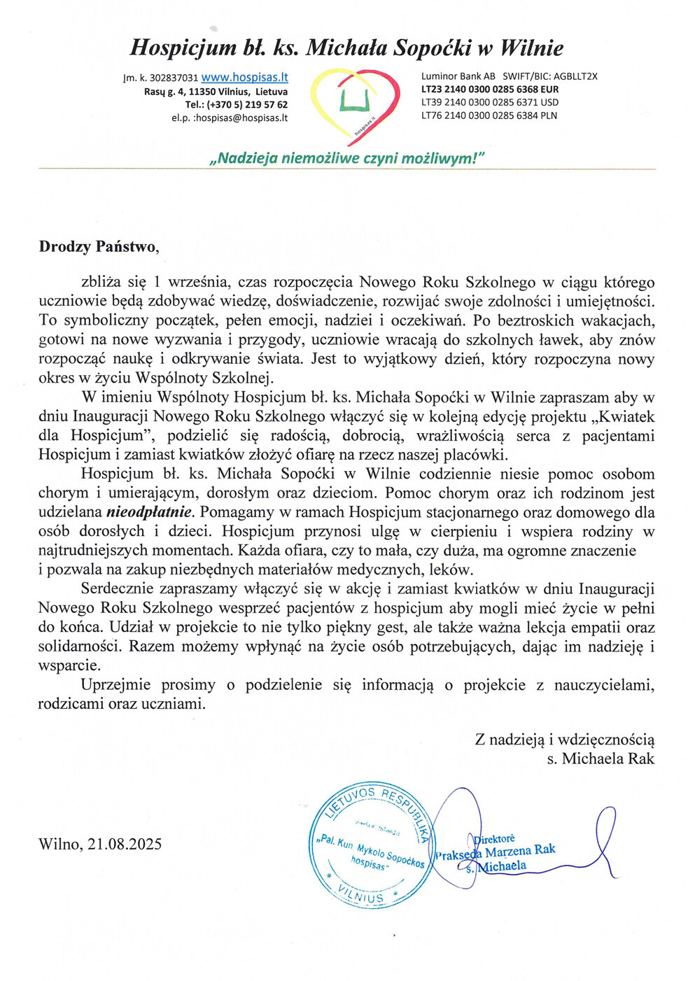 Renginių metu kviečiame aktyviai dalyvauti labdaros akcijoje „Gėlė hospisui“.