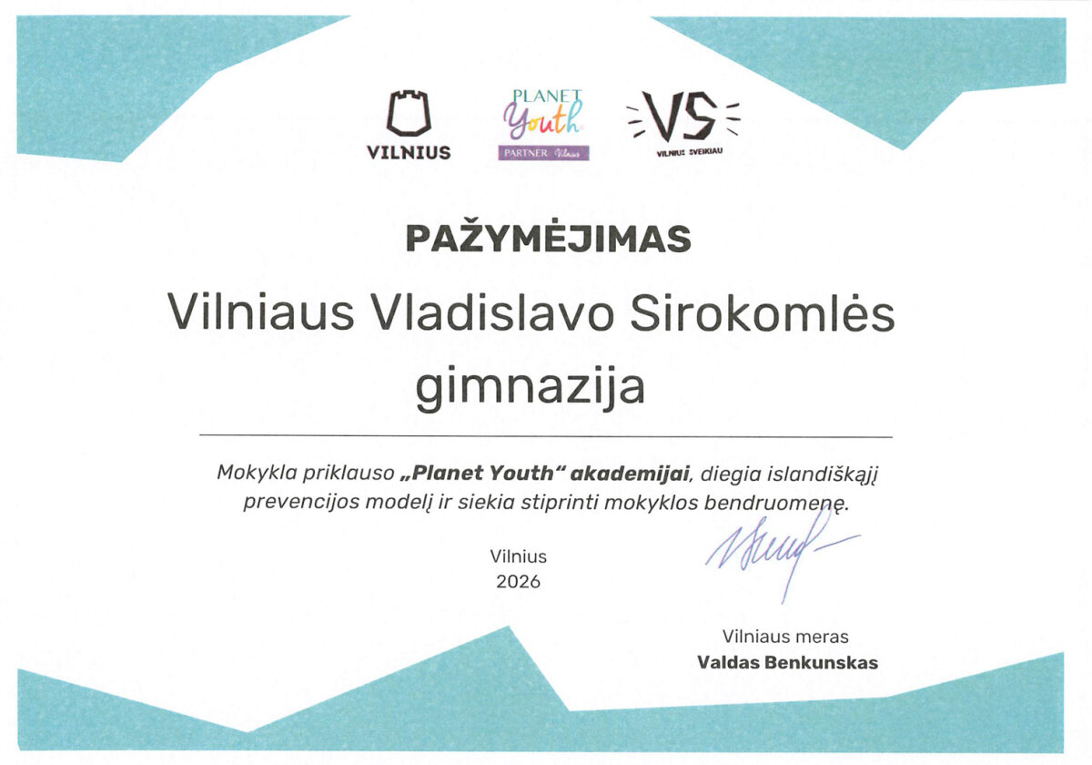 Vilniaus Vladislavo Sirokomlės gimnazija „Planet Youth“ akademijos dalyvė!