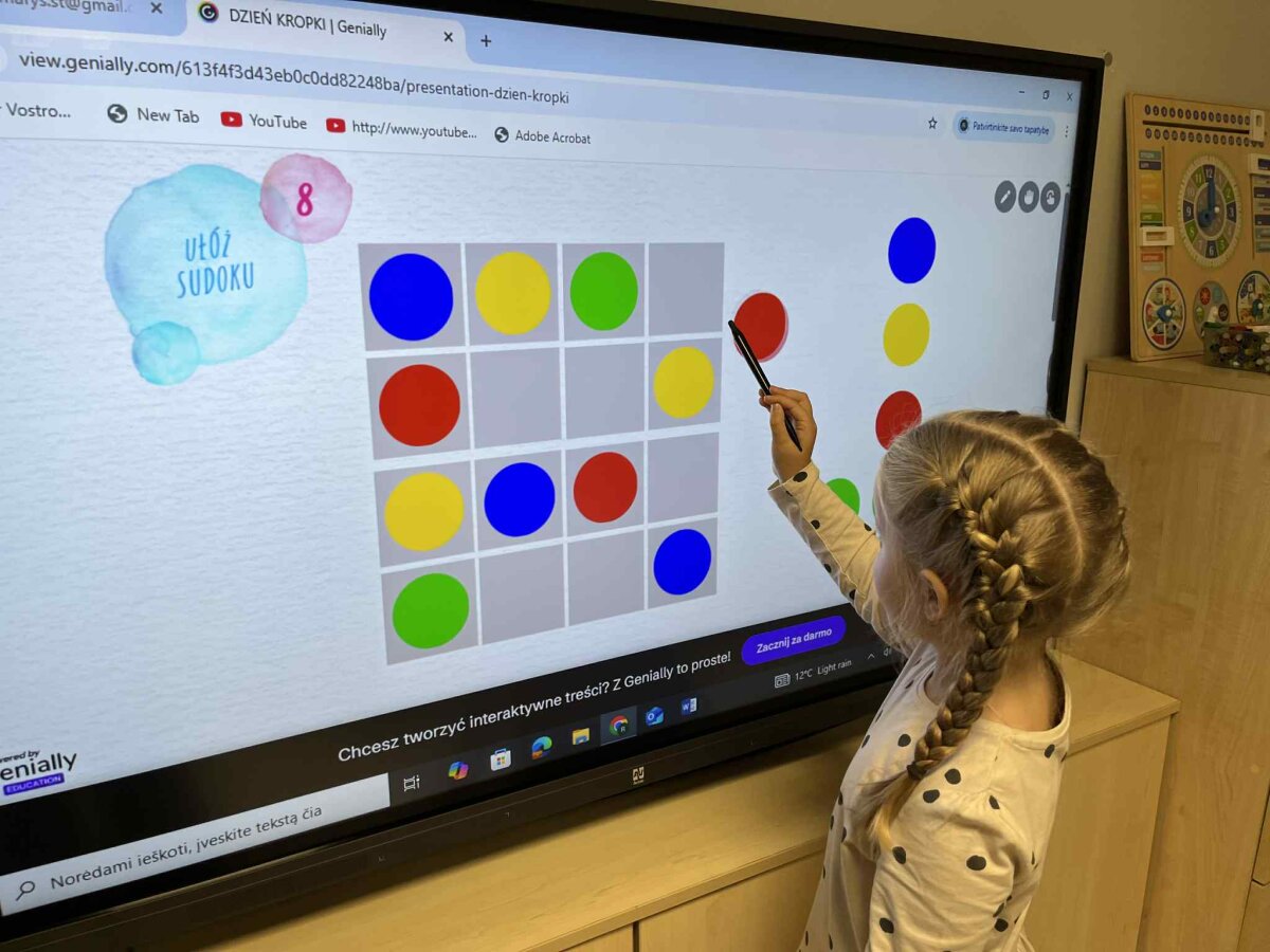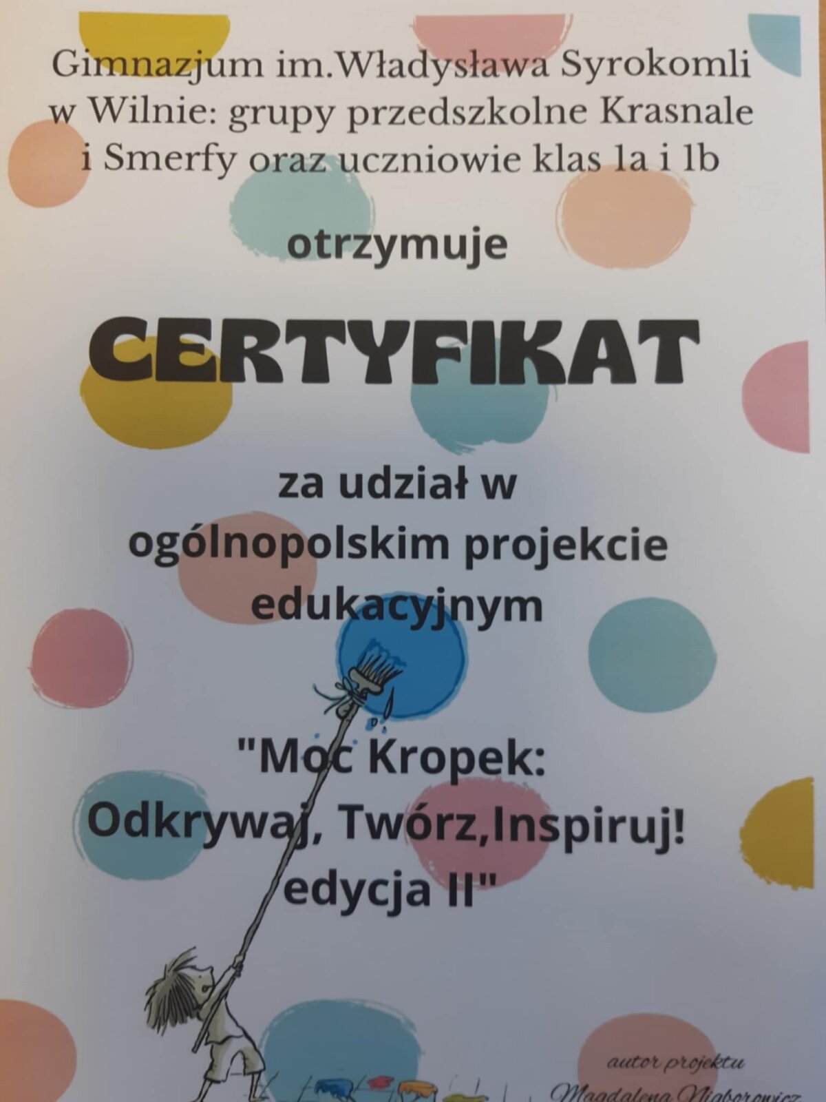 Mūsų gimnazijos priešmokyklinių grupių „Smurfai“ ir „Nykštukai“ vaikai bei 1 klasių mokiniai kartu su auklėtojomis ir logopede Alina Maštaler dalyvavo tarptautiniame edukaciniame projekte „Taškų jėga: Atrask, Kurk, Įkvėpk!“. Tą dieną mūsų gimnazijoje vyravo taškuota nuotaika, nes vyko įvairios veiklos. Vaikai apsirengė taškuotais drabužiais, naudojo taškus kurti, piešti, spalvinti, taip ugdydami pasitikėjimą savo gebėjimais ir idėjomis, o svarbiausia – kalbėjosi apie neatrastus savo talentus.