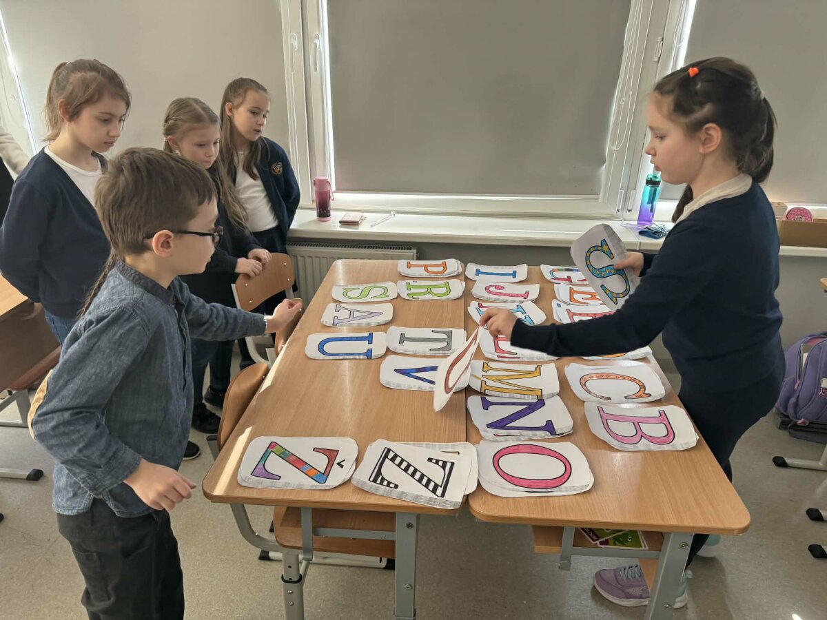 Užsiėmimas prasidėjo linksma susipažinimo veikla – vaikai sustojo ratu, pirmokai prisistatė ir parodė pasirinktą judesį, o penktokai juos pakartojo. Tai padėjo sukurti draugišką ir atvirą atmosferą. Vėliau vyko „raidžių judėjimo“ žaidimas: pirmokai gavo po raidę, judėjo skambant muzikai, o jai sustojus – kartu su penktokais dėliojo žodžius ir juos garsiai skaitė.