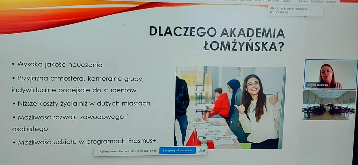 Pirmadienį, rugsėjo 29 d., mūsų gimnazijos III–IV klasių mokiniai dalyvavo nuotoliniame susitikime su Lomžos akademija – valstybine aukštąja mokykla Lenkijoje, siūlančia net 17 nemokamų studijų programų. Susitikimo metu mokiniai susipažino su: