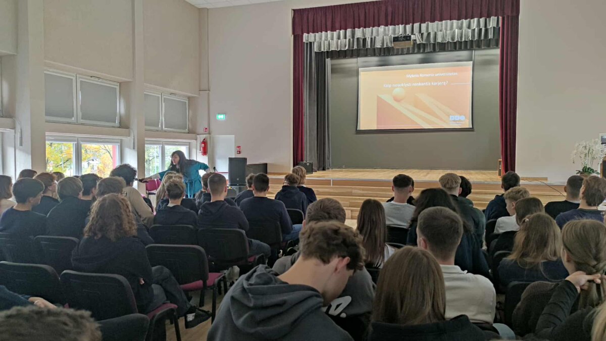 Spalio 27 dieną mūsų gimnazijos II-III kl. mokiniai dalyvavo paskaitoje „Kaip nesuklysti renkantis karjerą?“, kurioje sužinojo, kaip geriau pažinti save, atrasti savo stipriąsias asmenybės puses, efektyviai pasinaudoti karjeros galimybėmis ir priimti teisingus sprendimus renkantis karjeros kelią.