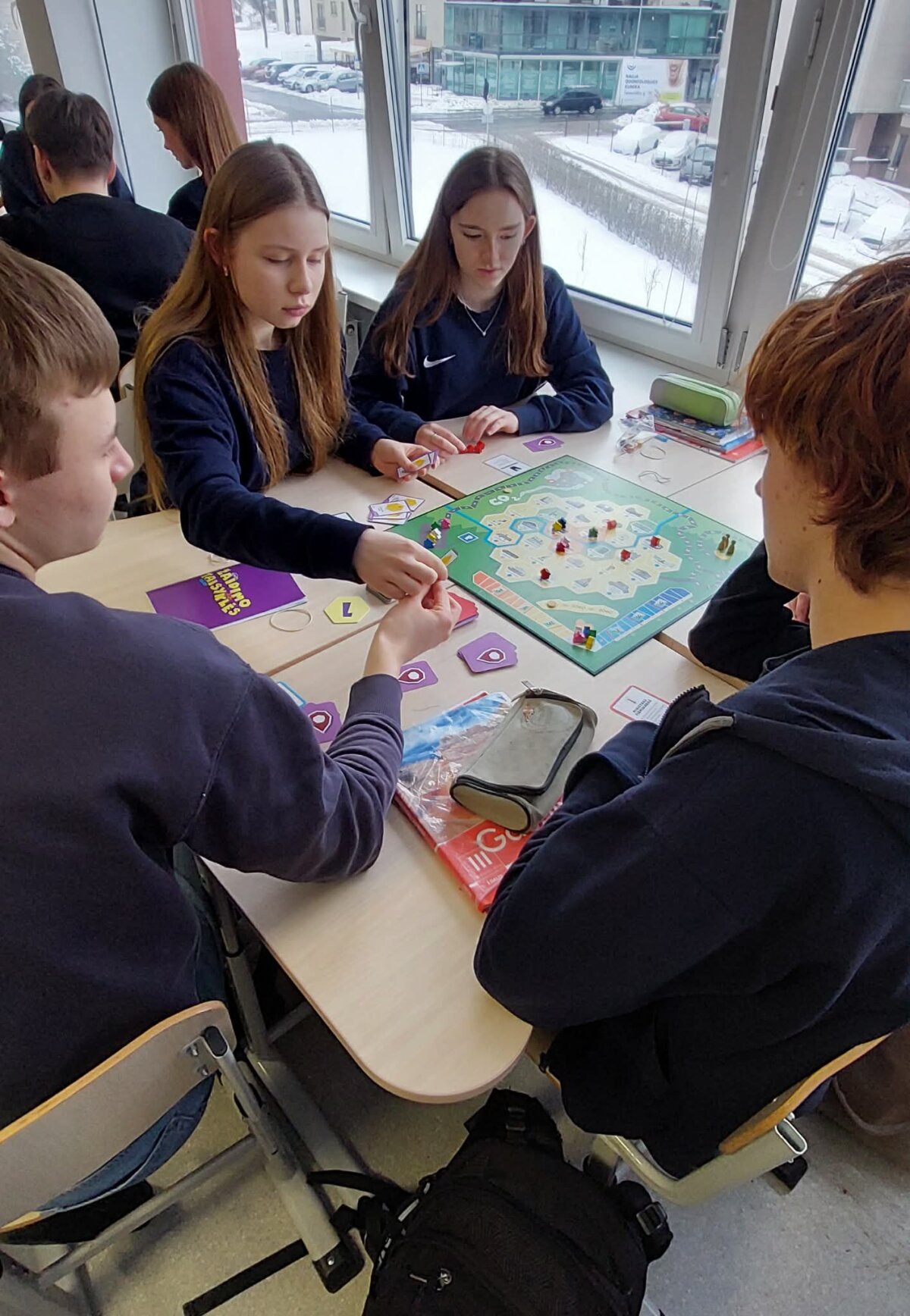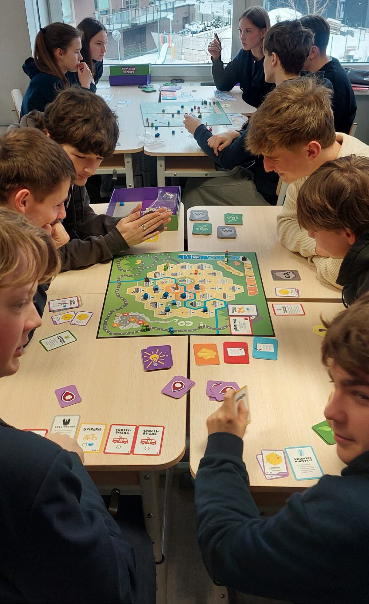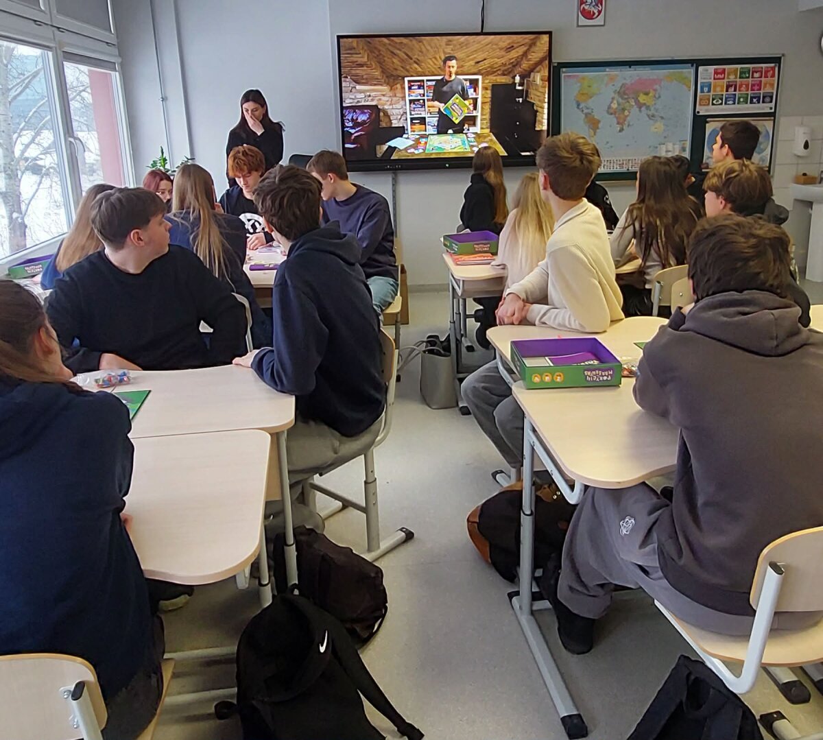 Vasario 11 dieną 11 klasių mokiniai dalyvavo netradicinėje geografijos pamokoje, integruotoje su karjeros ugdymu. Jos metu jaunuoliai išbandė edukacinį stalo žaidimą „Pokyčių maršrutas“, sukurtą Vilniaus jaunimo politikos centro, laimėjusio I vietą Vilniaus miesto savivaldybė projekte „neŠylam“. Pamokos metu vienuoliktokai gilinosi į klimato kaitos priežastis ir pasekmes, analizavo tvaraus judumo sprendimus bei diskutavo apie miestų ateities scenarijus. Dirbdami komandose mokiniai sprendė realias situacijas, vertino transporto poveikį aplinkai ir ieškojo būdų, kaip jų kasdieniai pasirinkimai gali prisidėti prie taršos mažinimo. Edukacinė veikla buvo papildyta karjeros ugdymo elementais – mokiniai susipažino su profesijomis, susijusiomis su urbanistika, aplinkosauga, klimato politika, transporto planavimu ir projektų valdymu. Refleksijos metu dalyviai akcentavo, kad interaktyvus žaidimo formatas padėjo geriau suprasti sudėtingas globalias temas ir paskatino aktyviau įsitraukti į diskusijas apie savo vaidmenį kuriant tvaresnį miestą. „Pokyčių maršrutas“ – daugiau nei penkis mėnesius kurtas edukacinis įrankis, gimęs iš jaunų žmonių, tvarumo ir dizaino ekspertų bendrakūros. Pamoka parodė, kad geografija gali tapti erdve, kurioje formuojasi ne tik žinios, bet ir pilietinė atsakomybė bei sąmoningas požiūris į ateities karjerą.