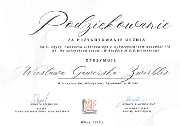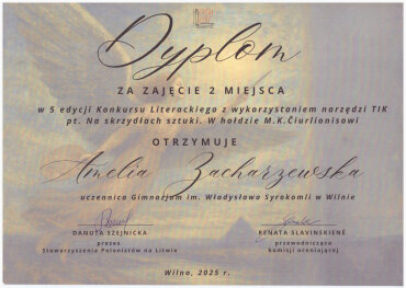 Gratulujemy uczennicom: Kamili Turlińskiej (klasa 9a), Amelii Zacharzewskiej (klasa 6a), Emilii Puszklewicz (klasa 5c) za zajęcie II miejsca w kategoriach: e.gazetka – 9 klasa, e-książeczka – 6 klasa, pocztówka okolicznościowa – 5 klasa 5. edycji konkursu literackiego z wykorzystaniem narzędzi TIK „Na skrzydłach sztuki. W hołdzie M. K. Čiurlionisowi“. Dziękujemy nauczycielkom: IT p. Halinie Stankiewicz (5-6 klasy) i polonistce p. Wiesłąwie Gawerskiej-Żwirblis (9 klasa) za przygotowanie uczennic do konkursu.