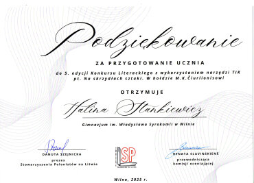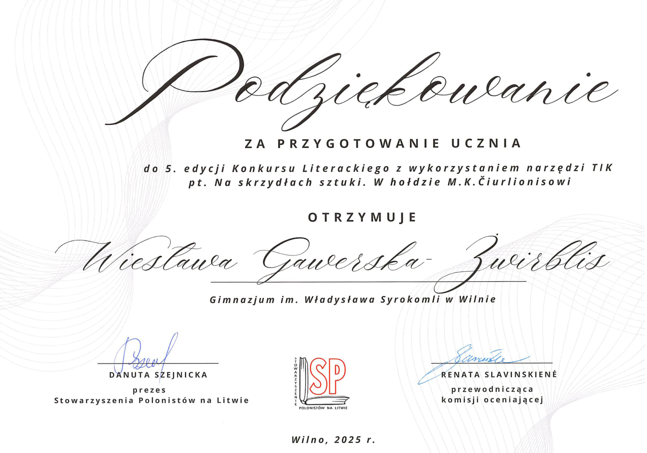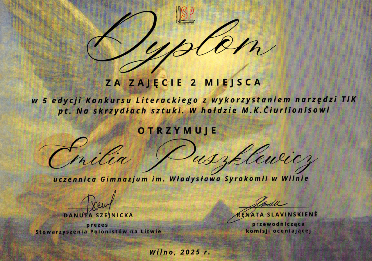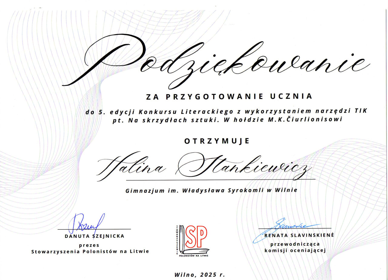 Gratulujemy uczennicom: Faustynie Stacevičiūte (klasa IIIa) i Izabeli Pauli Veiknyte (klasa Ia), za zajęcie II miejsca w konkursie „Wiedza o życiu i twórczości M. K. Ogińskiego i M. K. Čiurlionisa”. Konkurs był częścią projektu „Polonez, który łączył narody: Ogiński, Cziurlionis i historia, która wciąż brzmi”. Dziękujemy nauczycielkom muzyki: p. Renacie Juzokienė p. Jolancie Dekevičienė za przygotowanie uczennic do konkursu.
