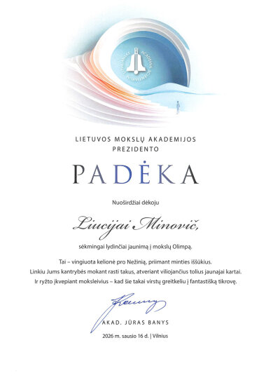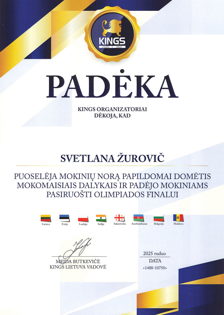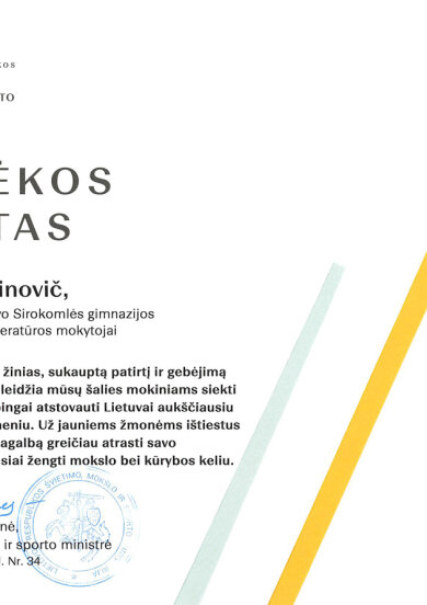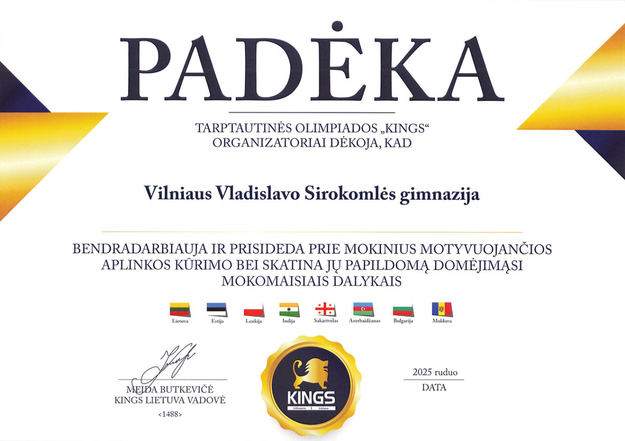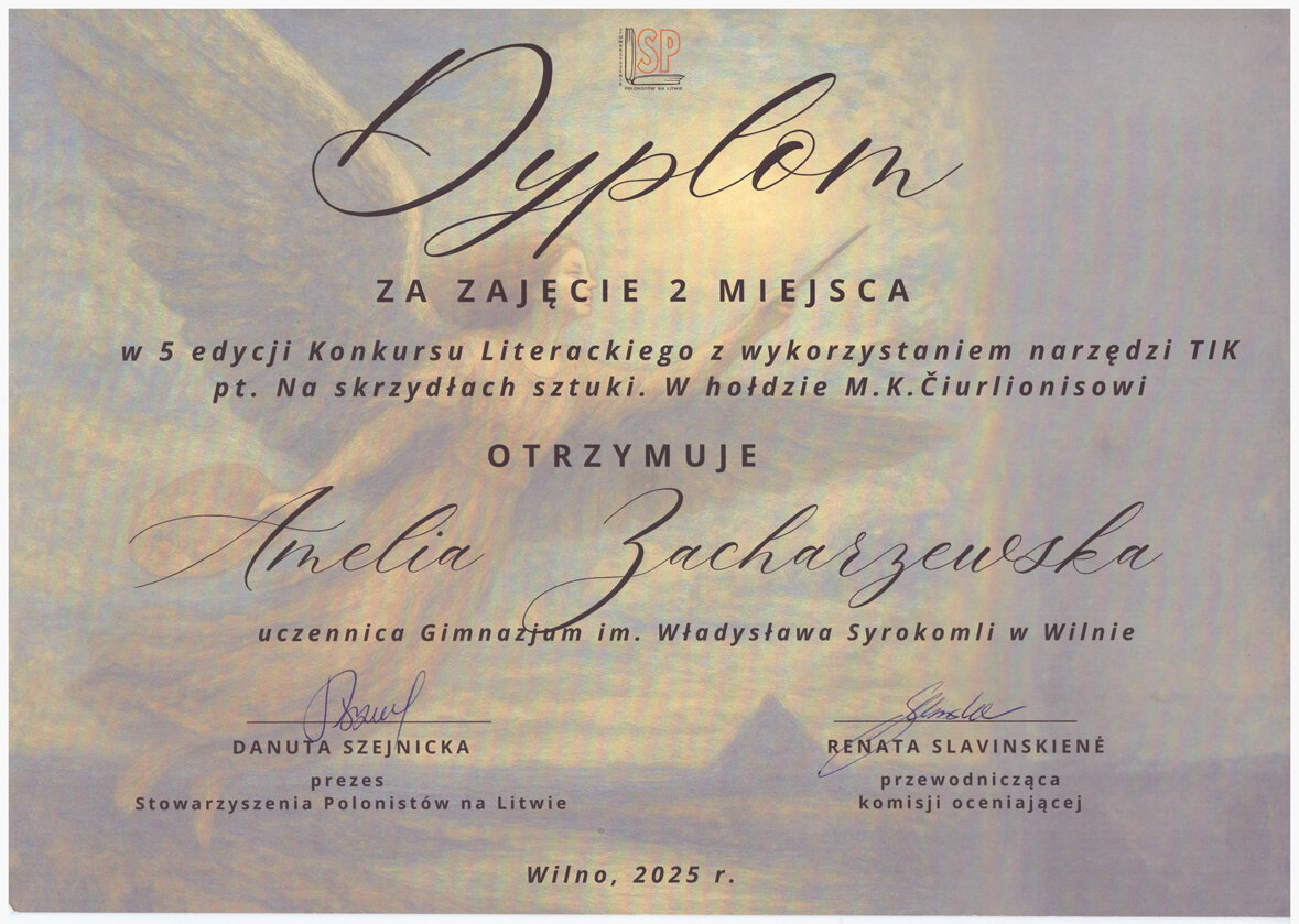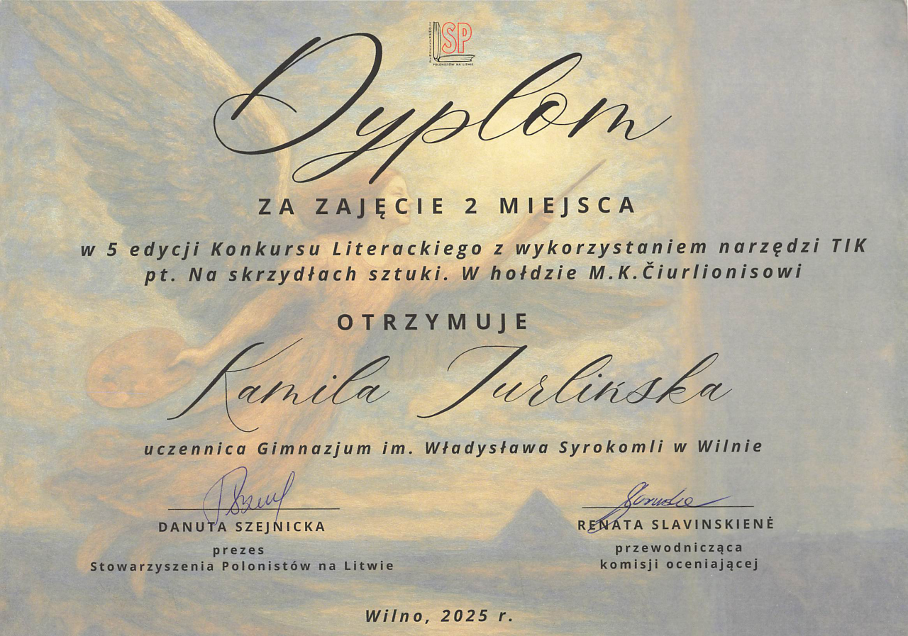 Gratulujemy uczennicom: Faustynie Stacevičiūte (klasa IIIa) i Izabeli Pauli Veiknyte (klasa Ia), za zajęcie II miejsca w konkursie „Wiedza o życiu i twórczości M. K. Ogińskiego i M. K. Čiurlionisa”. Konkurs był częścią projektu „Polonez, który łączył narody: Ogiński, Cziurlionis i historia, która wciąż brzmi”. Dziękujemy nauczycielkom muzyki: p. Renacie Juzokienė p. Jolancie Dekevičienė za przygotowanie uczennic do konkursu.