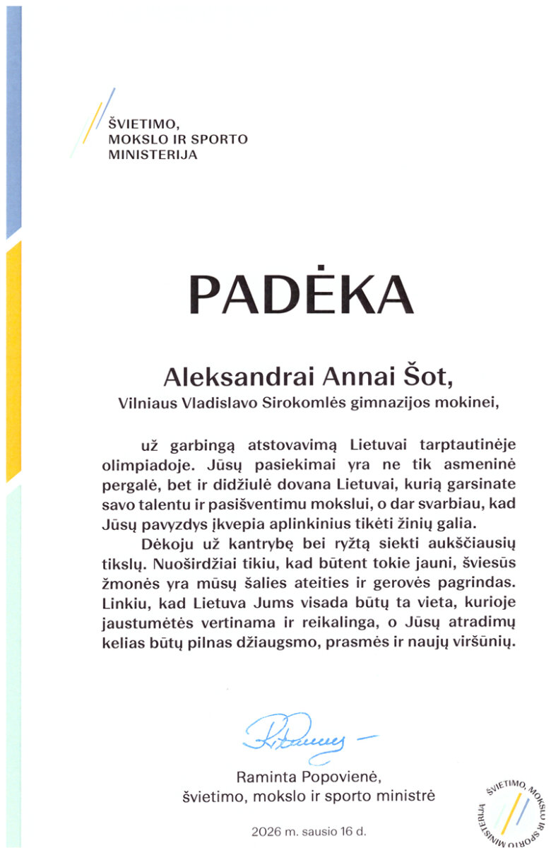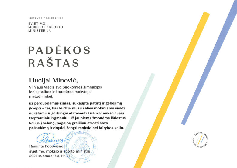 Gratulujemy uczennicy klasy IVb Aleksandrze Annie Szot za godne reprezentowanie Litwy w Międzynarodowej Olimpiadzie Języka Polskiego i Literatury w Polsce. Dziękujemy polonistce p. Łucji Minowicz za przygotowanie uczennicy do olimpiady.