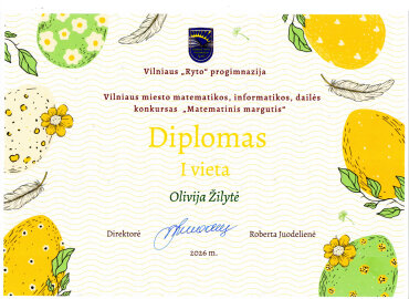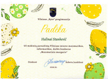 Gratulujemy Oliwii Żilyte (klasa 6a), która zajęła I miejsce w konkursie integrowanym z matematyki, informatyki, sztuki „Matematyczne jajko” dla uczniów klas 5–8 szkół ogólnokształcących miasta Wilna . Do konkursu uczennicę przygotowała starsza nauczycielka informatyki Halina Stankiewicz.