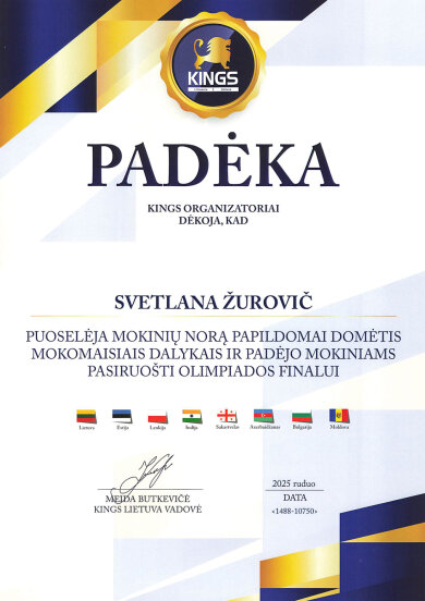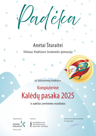 Gratulujemy Anecie Szturaite (klasa IVc), Oliwii Żilyte (klasa 6a), Emilii Puszklewicz (klasa 5c), Agacie Pażusinskaite (klasa 5c) za wysokie oceny komisji oceniającej w Republikańskim Konkursie Informatycznym „Kompiuterinė Kalėdų pasaka“. Dziękujemy starszej nauczycielce informatyki p. Halinie Stankiewicz za przygotowanie uczennic do konkursu.