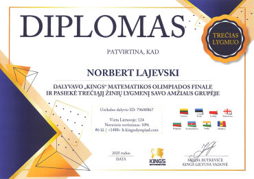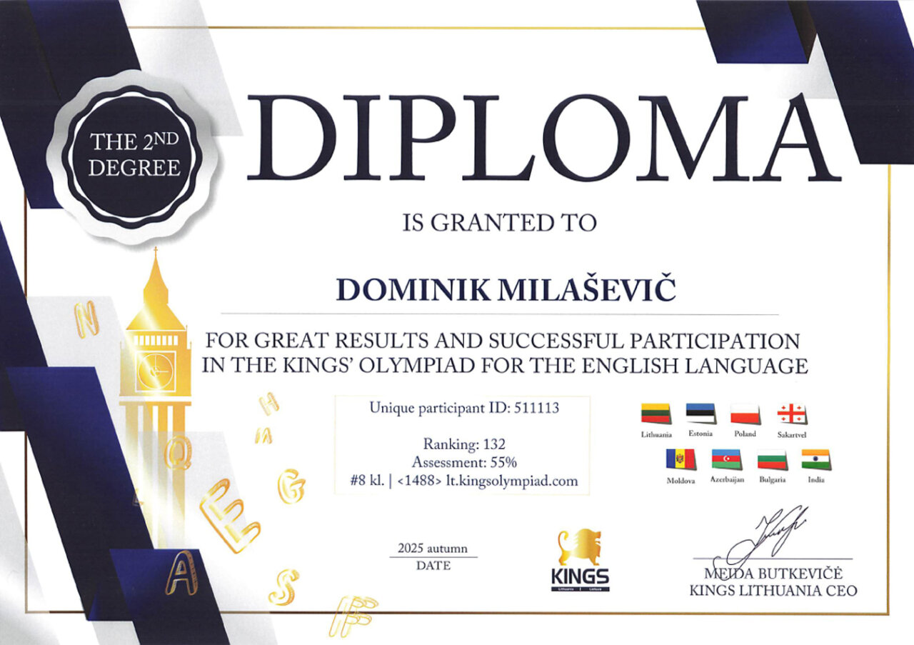 Gratulujemy uczniom naszego gimnazjum: Norbertowi Łajewskiemu za otrzymanie dyplomu III stopnia w olimpiadzie z matematyki i Dominikowi Miłaszewiczowi (klasa 8b) za otrzymanie dyplomu II stopnia w olimpiadzie języka angielskiego w finale Olimpiady „Kings ruduo 2025“.