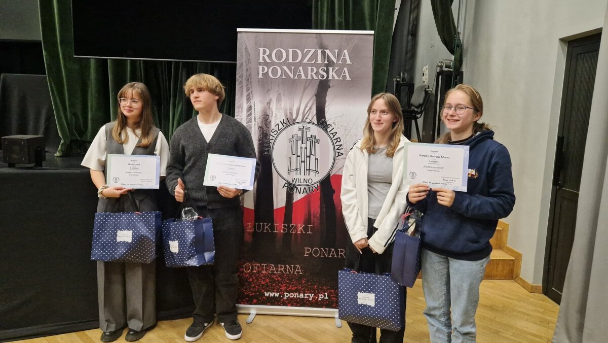 Wieczorem grupa uczniów uczestniczyła w Konferencji Ponarskiej w DKP, podczas której było też podsumowanie IV edycji Konkursu Ponarskiego ,,Kapłani Niezłomni’’. Nasi uczniowie są zdobywcami trzech pierwszych miejsc w kategorii literackiej: Karolina Kotryna Moroz zajęła I miesce, Aleksander Albert Uždavinys – II, a Greta Łabul – III miejsce. Karolinę, Gretę i Faustynę do konkursu przygotowała Barbara Dajnowicz, a Aleksandra – Wiesława Gawerska-Żwirblis.