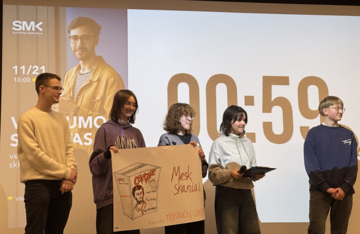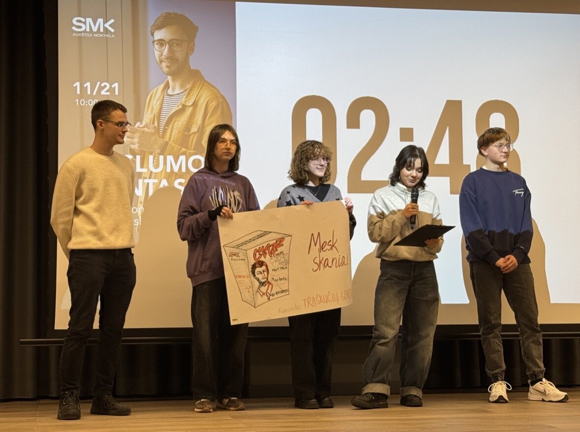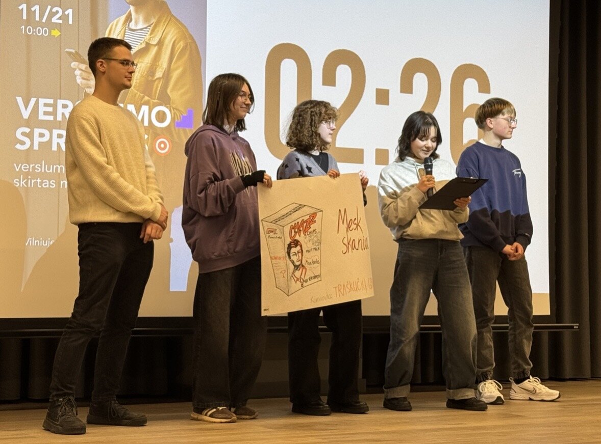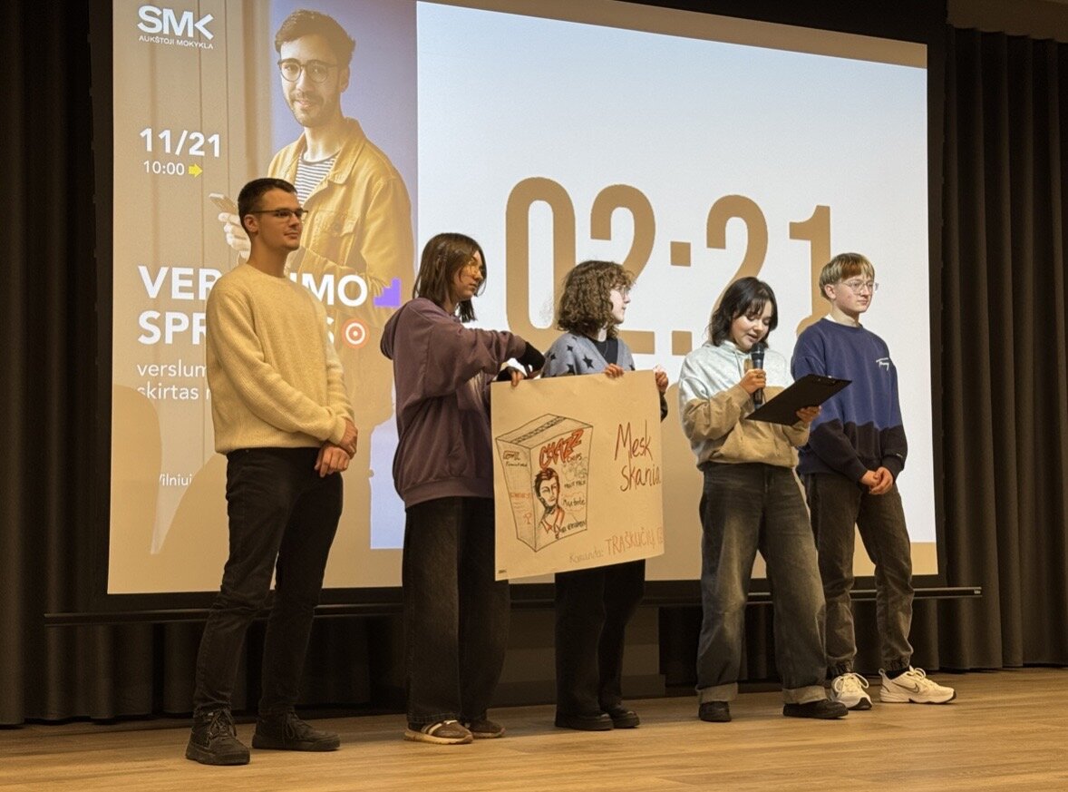 20 listopada 2015 r. pięciu uczniów klas 11 i 12 (Izabela Buša, Tomaš Sinkevič, David Romeiko, Diana Korolkova, Faustyna Stacevičiutė) wzięło udział w zabawnym i intensywnym republikańskim konkursie przedsiębiorczości „Verslumo sprintas 25” w SMK Aukštoji mokykla. Przez cały dzień rozwiązywali prawdziwe wyzwania biznesowe, tworzyli pomysły na produkty i usługi dla prawdziwych firm oraz wzmacniali swoją kreatywność, krytyczne myślenie i pracę zespołową z pomocą mentorów SMK . Odważnie wyszli na scenę ze swoimi "elevator pitch'ami" jak prawdziwe start-up'y, wykazali się dużą kreatywnością i wykonali świetną robotę pomimo wysokiej konkurencji 19 silnych zespołów oraz poważnej komisji oceniającej przedstawicieli z firm RIMI, Aconitum, Transcom, Chazz i Labas. Brawo WY!!