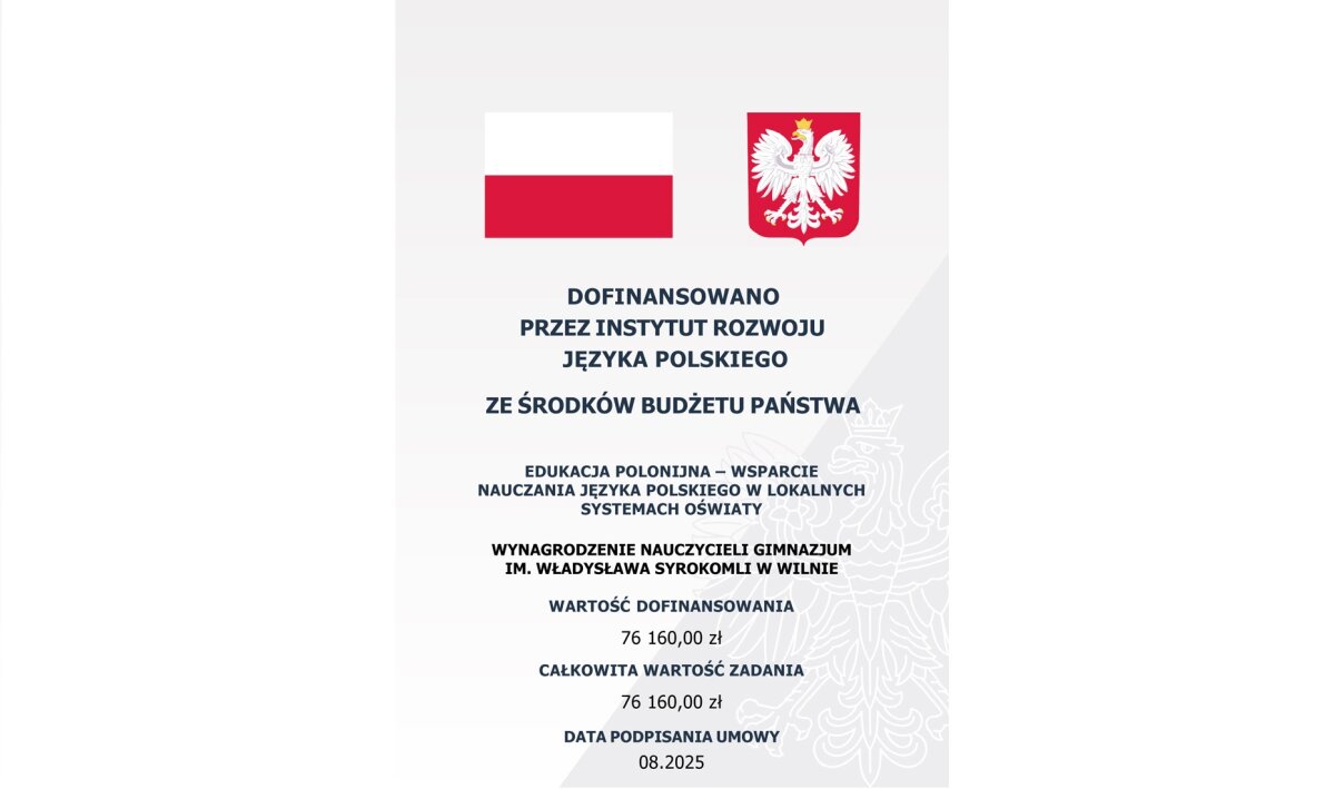 W ramach realizacji przedsięwzięcia Gimnazjum im. Władysława Syrokomli w Wilnie otrzymało dofinansowanie z Instytutu Rozwoju Języka Polskiego ze środków budżetu Państwa Polskiego w wysokości 55 100,00 zł.