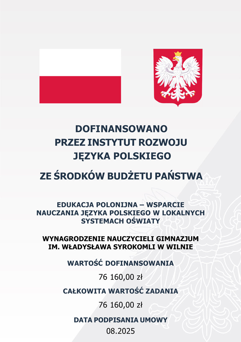 W ramach przedsięwzięcia „Edukacja polonijna – wsparcie nauczania języka polskiego w lokalnych systemach oświaty”, realizowanego przez Fundację „Pomoc Polakom na Wschodzie” im. Jana Olszewskiego, dofinansowanego przez Instytut Rozwoju Języka Polskiego ze środków budżetu Państwa Polskiego 9 nauczycieli Gimnazjum im. Władysława Syrokomli w Wilnie otrzymało wynagrodzenie. Całkowita wartość zadania 76 160, 00 zł.