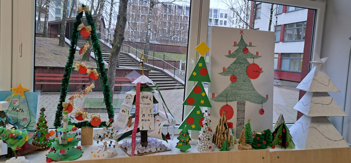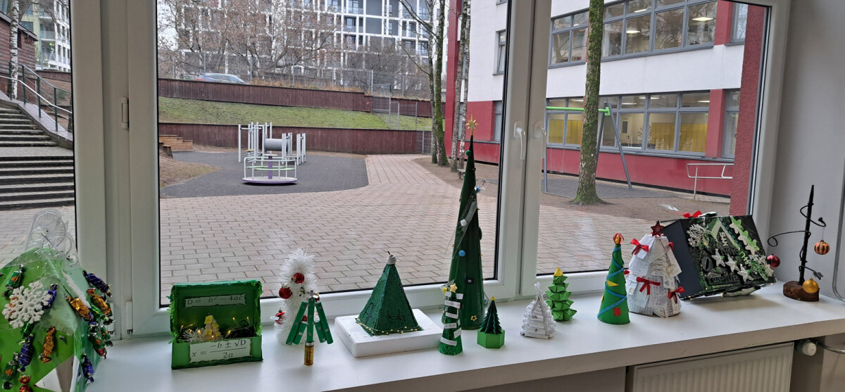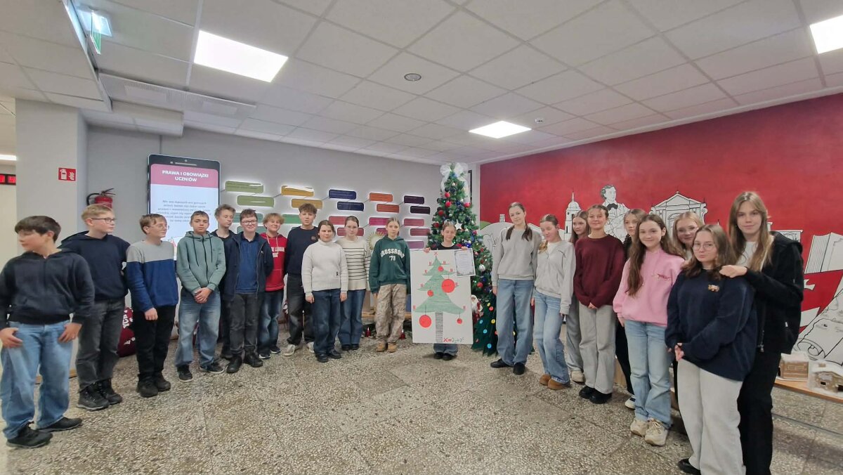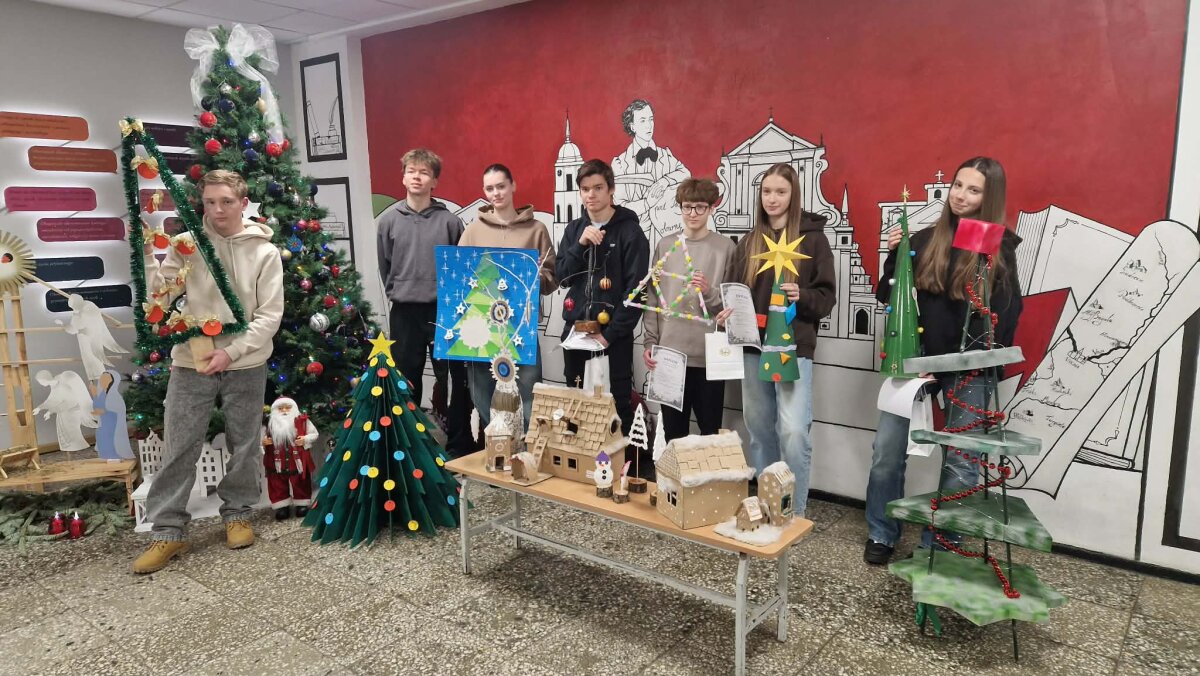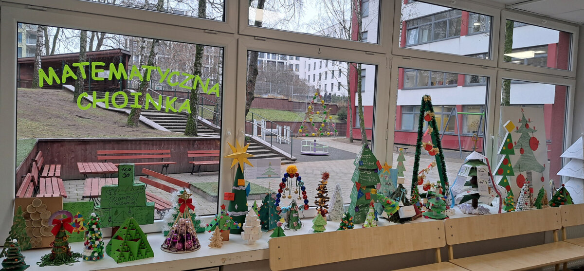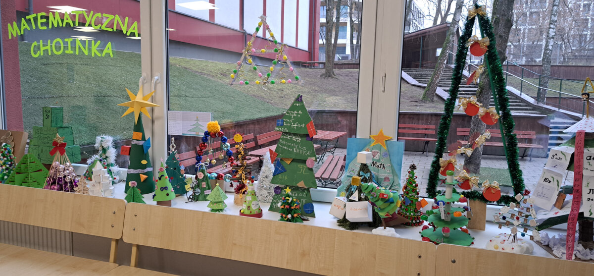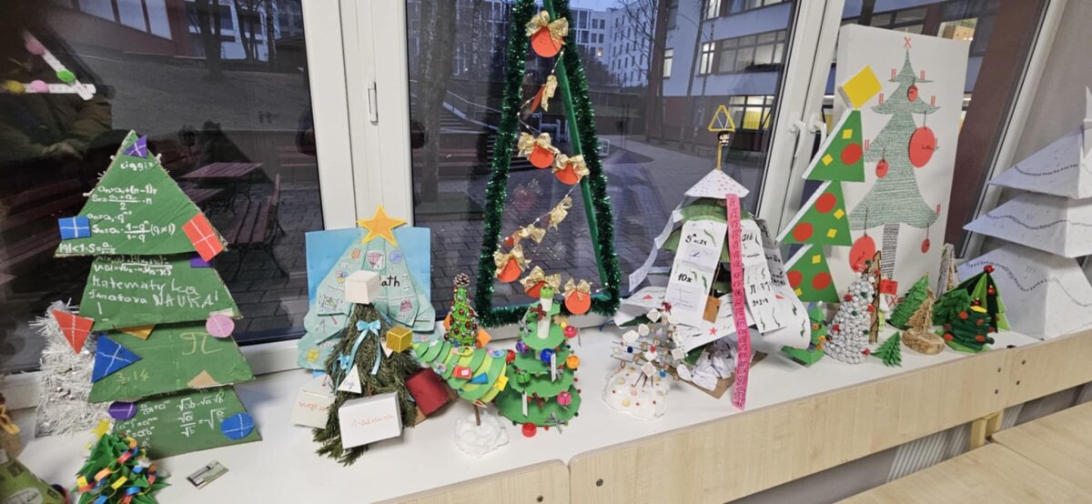 Projekt „Matematyczna choinka” był działaniem edukacyjno-artystycznym skierowanym do uczniów klas 5–12, którego ideą było twórcze połączenie matematyki ze świąteczną atmosferą szkoły. Uczniowie samodzielnie wykonywali pomysłowe choinki matematyczne, wykorzystując liczby, figury i bryły geometryczne, wzory, działania oraz symbole matematyczne, łącząc wiedzę z estetyką i kreatywnością. Gotowe prace zostały zaprezentowane w holu szkolnym, gdzie stały się wyjątkową świąteczną dekoracją, upiększając przestrzeń szkoły i przyciągając uwagę całej społeczności szkolnej.