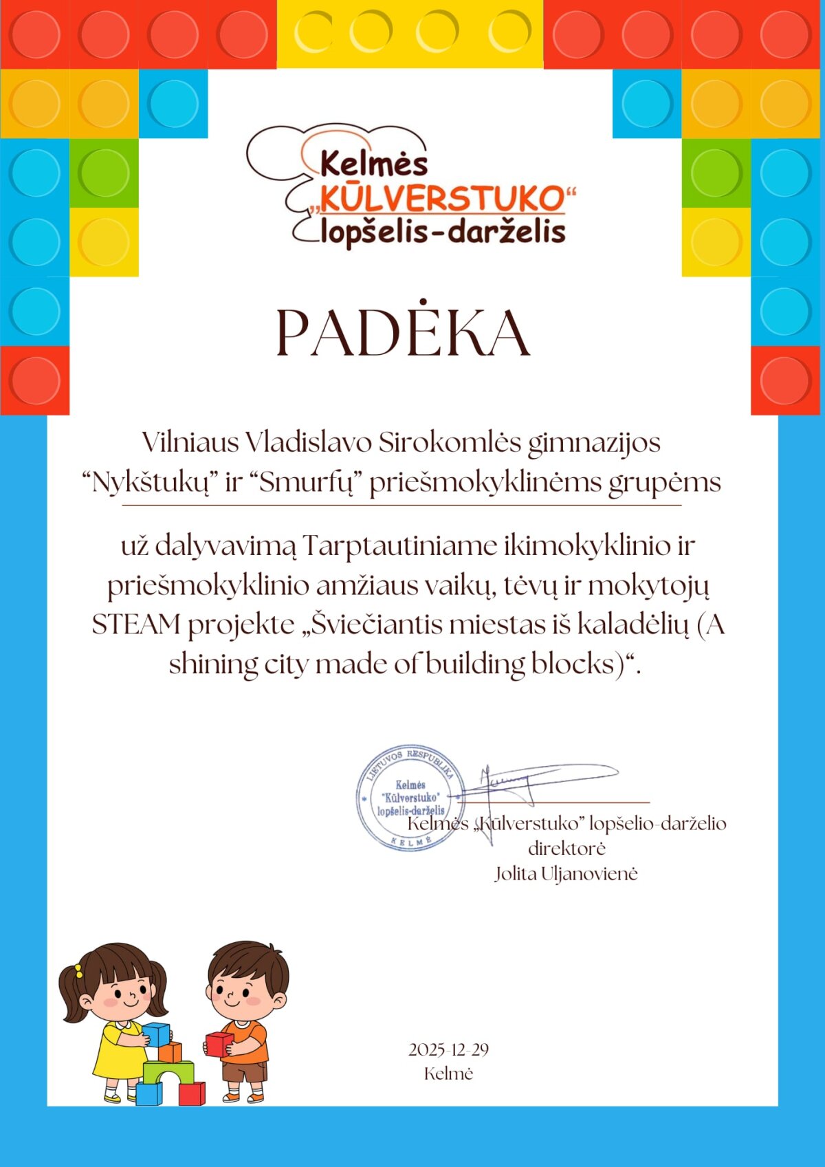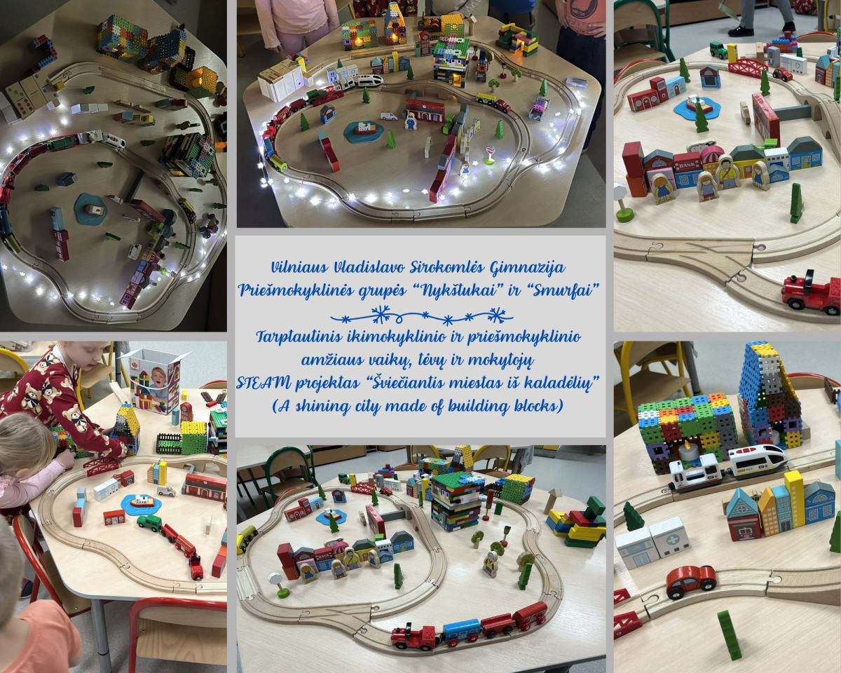 W dniach 1–26 grudnia 2025 r. grupy przygotowawcze Krasnale i Smerfy wzięły udział w międzynarodowym projekcie STEAM „Šviečiantis miestas iš kaladėlių” („A shining city made of building blocks”). Dzieci z dużym zaangażowaniem wzięły udział w twórczych działaniach. Wspólnie planowały i budowały świecące miasto, wykorzystując różnego rodzaju klocki o różnych kształtach, kolorach i fakturach. Podczas pracy rozwijały wyobraźnię, kreatywność oraz umiejętność współpracy w grupie. Mali konstruktorzy eksperymentowali ze światłem, z łączeniem elementów, tworząc domy, wieże, drogi i inne budowle miejskie. Projekt pozwolił dzieciom w praktyczny sposób poznawać elementy STEAM poprzez zabawę i działanie, co było cennym doświadczeniem edukacyjnym i źródłem radości.