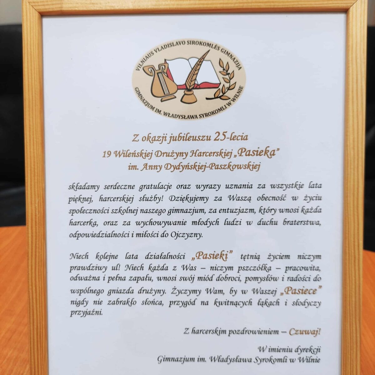 W dniach 24-26 października 2025 r. kadra 19 Wileńskiej Drużyny Harcerskiej ,,Pasieka” im. Anny Dydyńskiej-Paszkowskiej zorganizowała biwak w Gimnazjum im. Władysława Syrokomli w Wilnie dla swoich harcerek. To nie był zwyczajny biwak, to był biwak jubileuszowy, gdyż drużyna w tym roku obchodzi swoje 25-lecie. Gratulujemy wszystkim harcerkom „Pasieki” tym byłym i tym obecnym pięknego jubileuszu! Życzymy, by wszystkie „pszczółki”, które wyleciały czy kiedyś jeszcze wylecą z naszej „Pasieki”, niosły pokój i dobro, radość i przyjaźń w duchu harcerskim. Czuwaj!