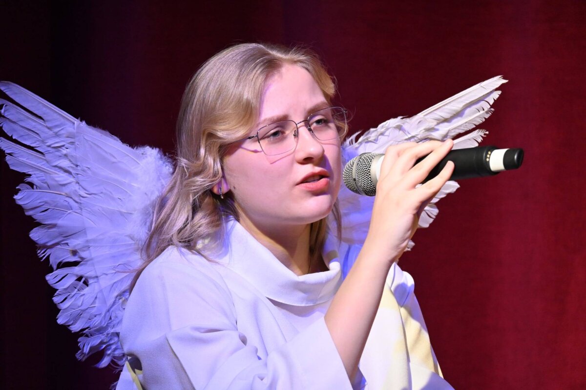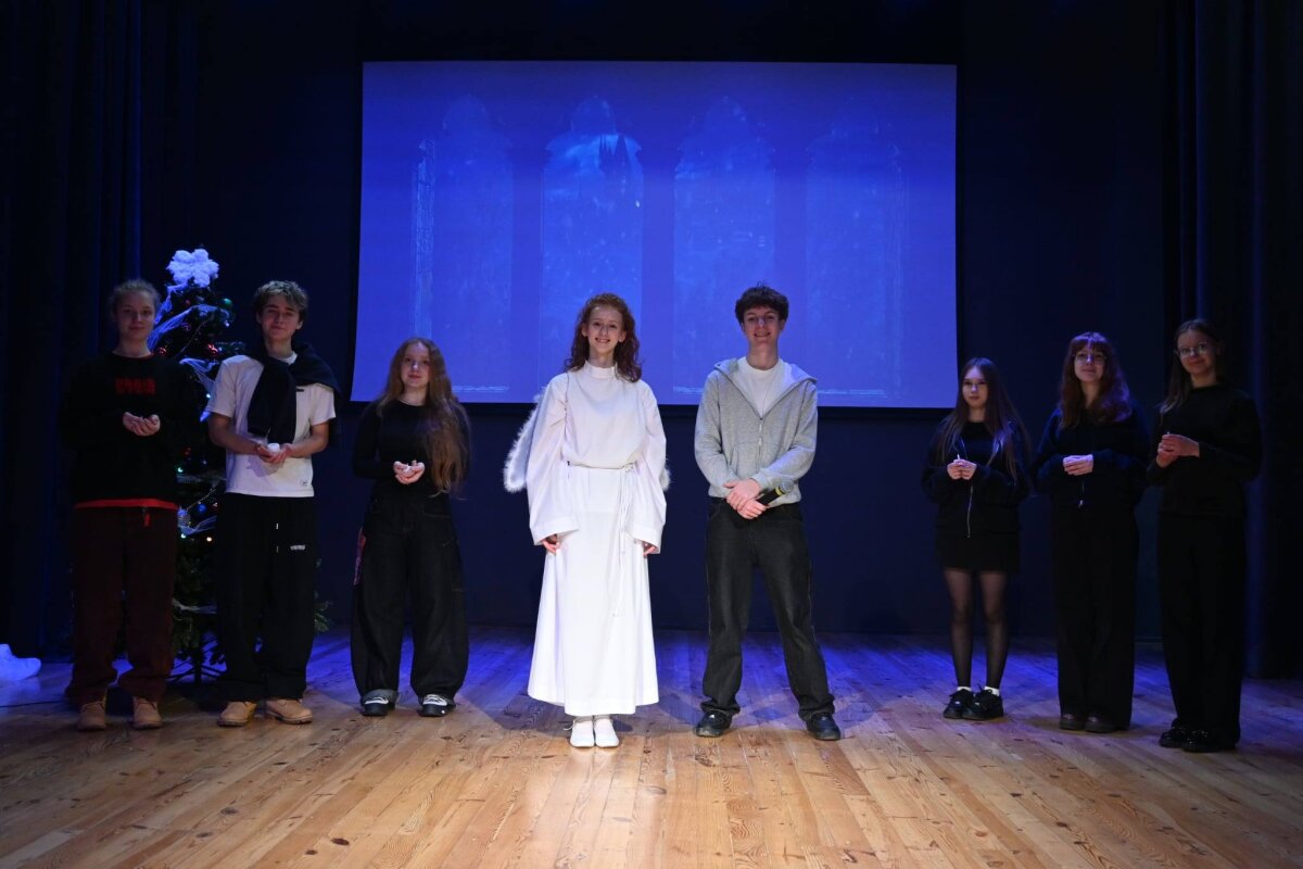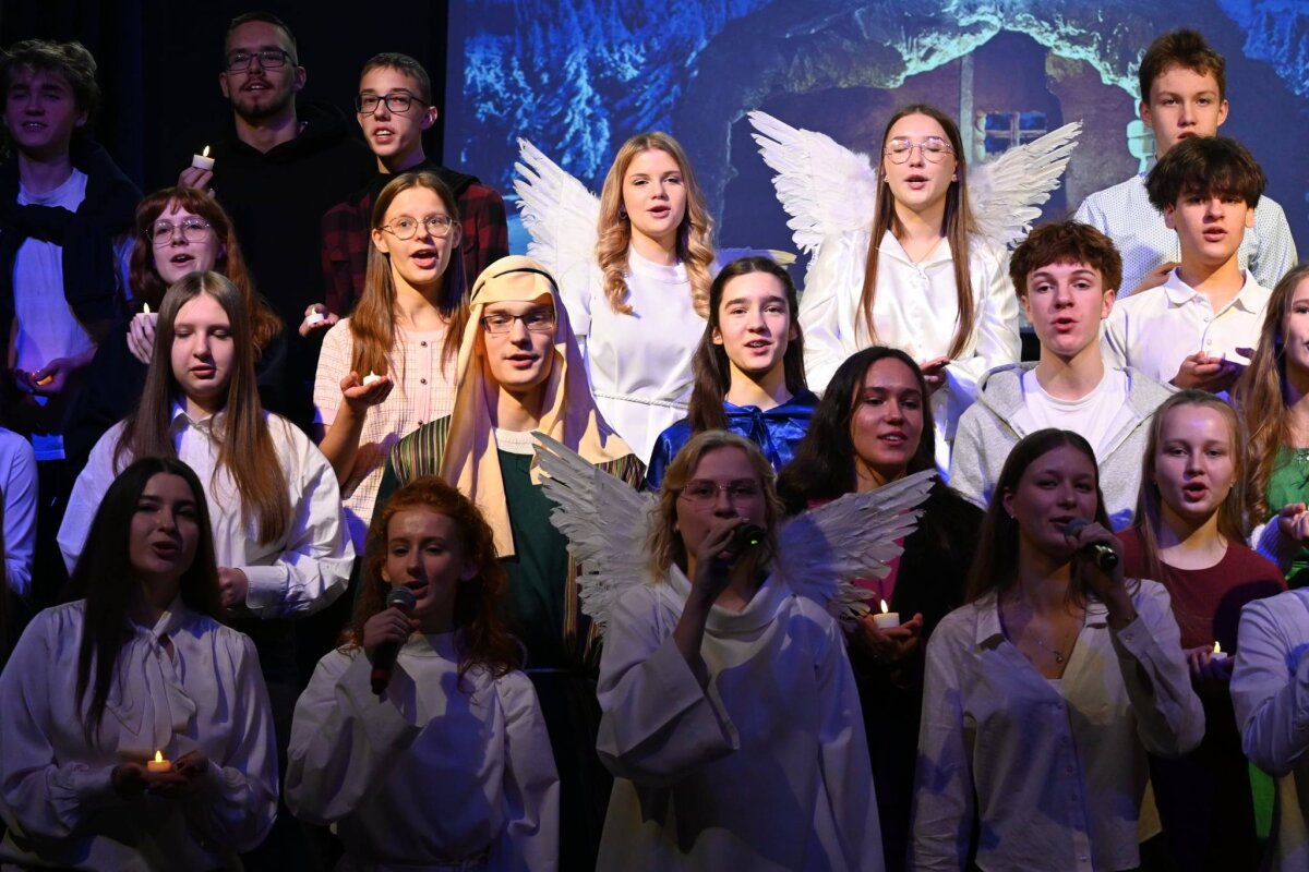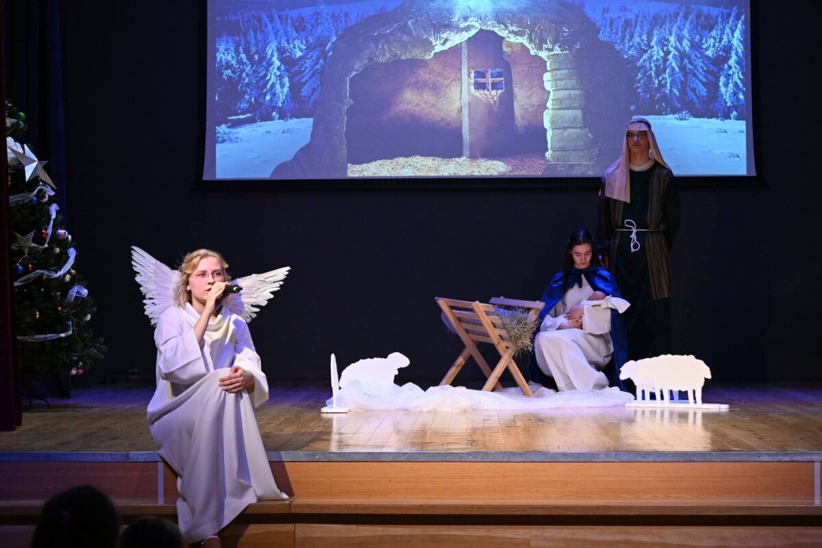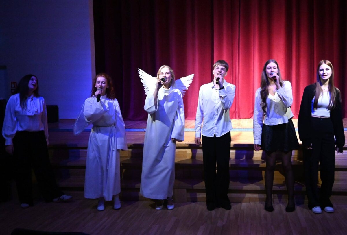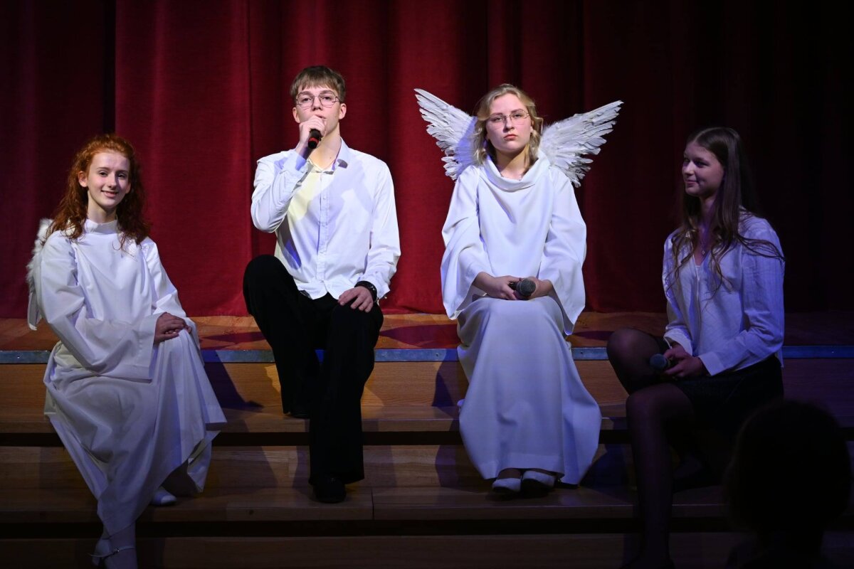 W murach naszej szkoły zapanowała świąteczna atmosfera za sprawą jasełek wystawionych przez uczniów klas 9-ych. Głównymi bohaterami opowieści byli zwyczajni uczniowie, którzy zmagali się z codziennymi problemami: uzależnieniem od gier, pogonią za modą czy ciągłym narzekaniem na świat. W tych postaciach każdy z nas mógł odnaleźć cząstkę siebie – swoje wątpliwości, słabości, ale i głębokie pragnienie bycia zrozumianym. Dzięki interwencji Archanioła i aniołów bohaterowie odbyli poruszającą podróż przez swoją przeszłość i przyszłość. To pozwoliło im zrozumieć własne błędy, a wizyta w ubogiej stajence stała się najlepszym lekarstwem na ich kłótnie. Przesłanie tegorocznych jasełek przypomniało nam wszystkim, że prawdziwy cud rodzi się wtedy, gdy potrafimy być razem i zobaczyć w drugim człowieku coś więcej niż tylko jego wady.