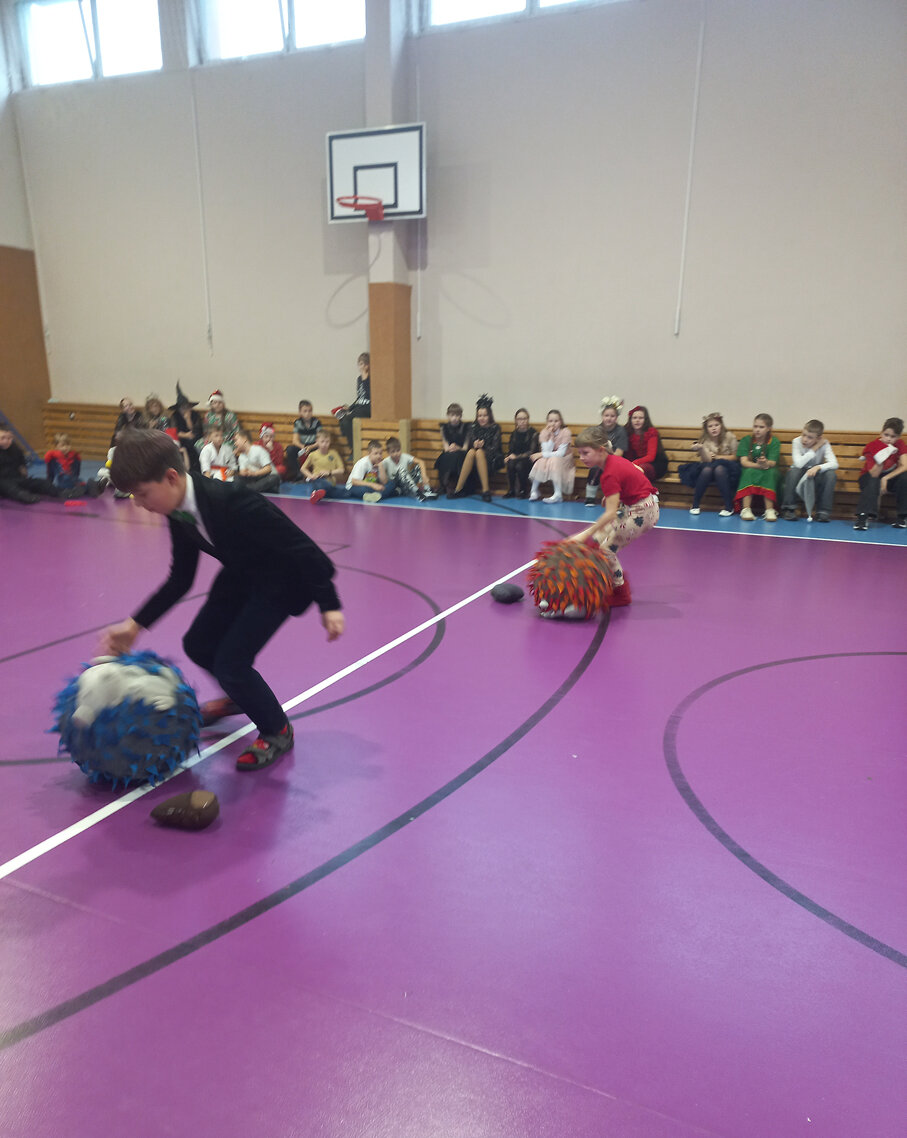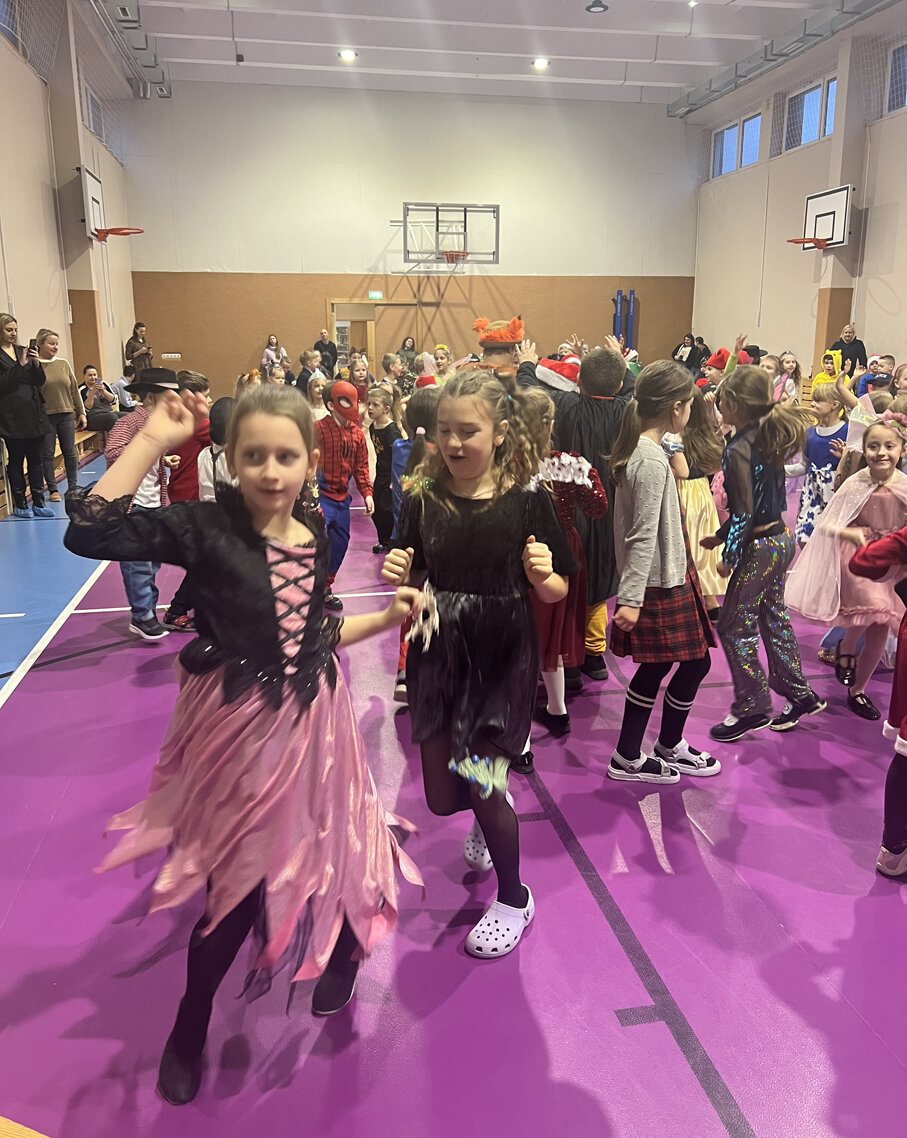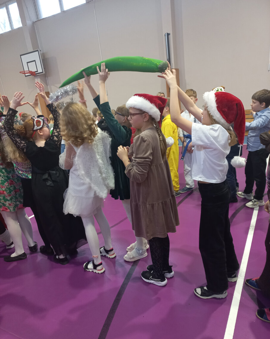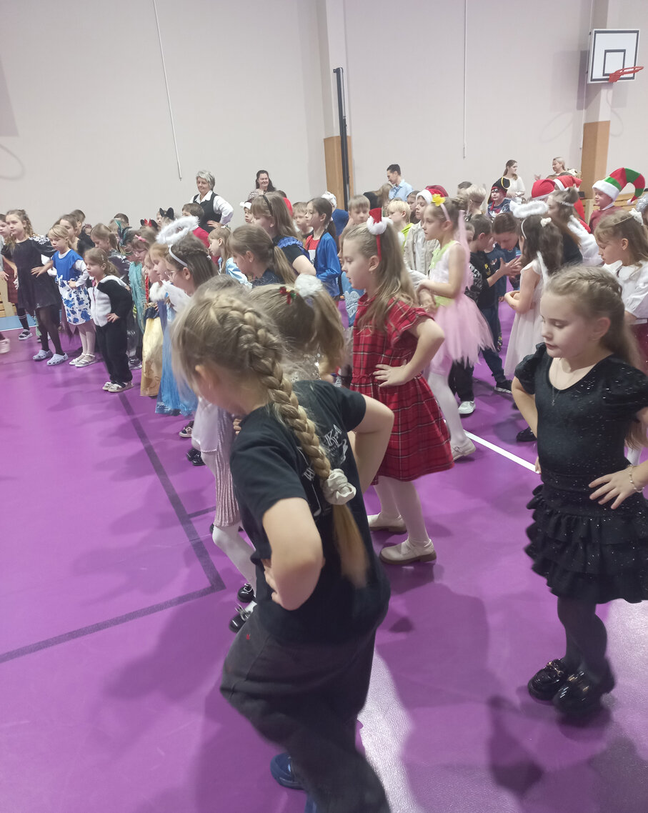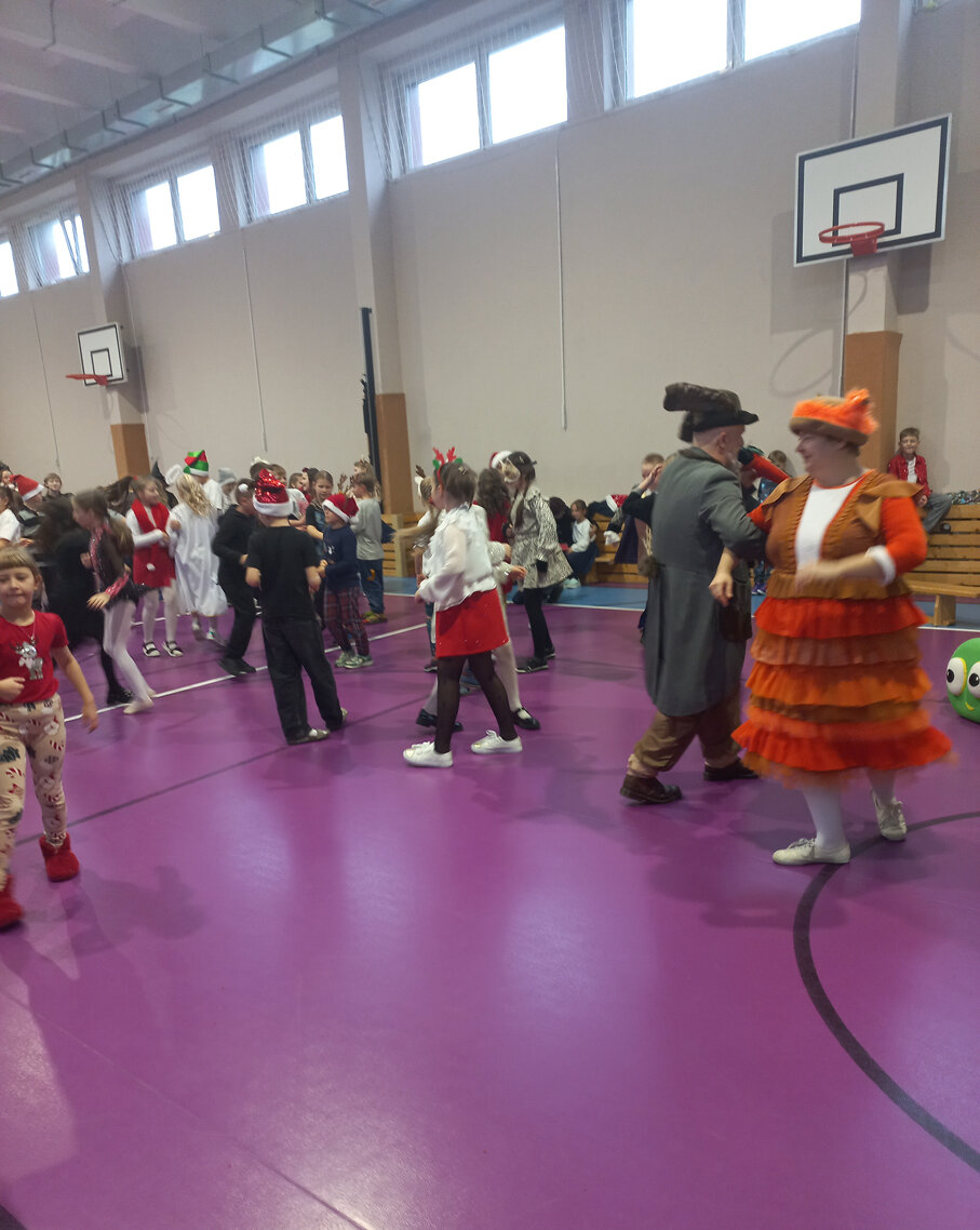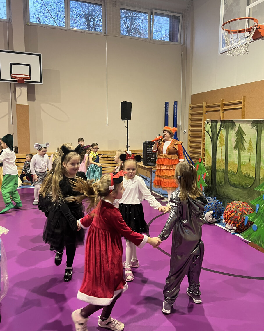 Drugiego zaś dnia dzieci fajnie się bawiły z aktorami - Zajączkiem i Wiewióreczką- w bajkowym lesie. Było wiele ciekawych zabaw, tańców, atrakcji, a dzieciom dopisywał wspaniały humor. A na koniec zjawił się długo oczekiwany święty Mikołaj, który chętnie zabawił się z dziećmi, a później ogłosił, że w klasach czekają na nie prezenty.